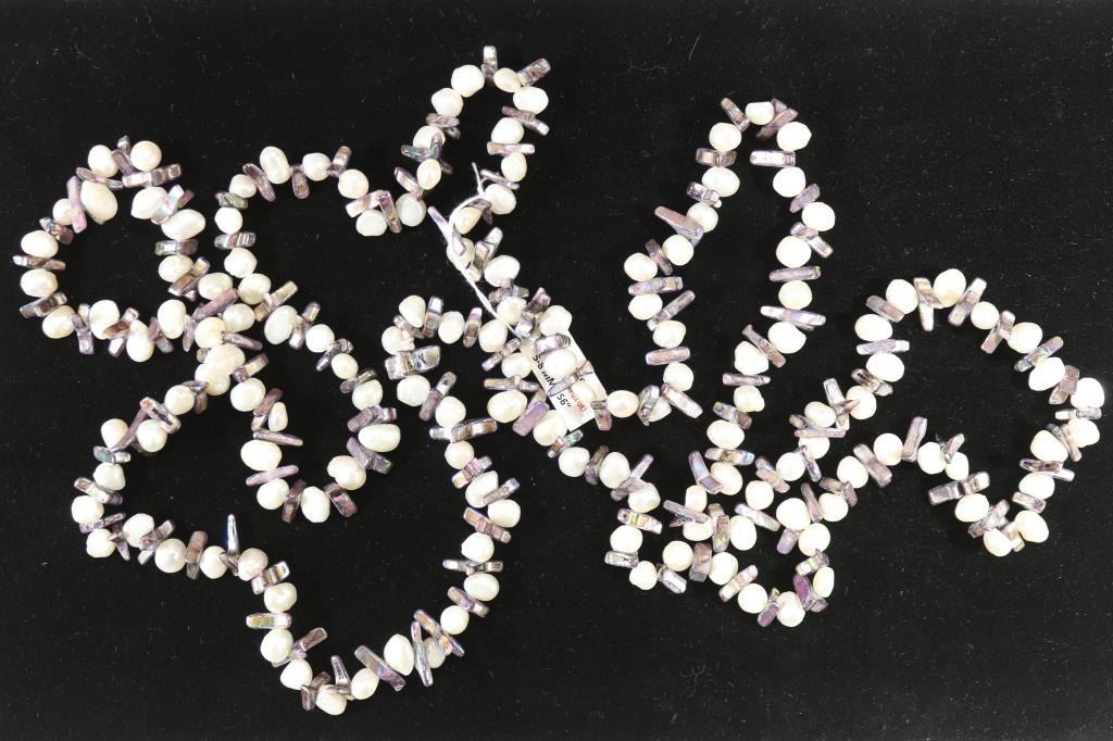 MULTI COLOR NECKLACE WITH WHITE PEARLS AND PURPLE / BLUE PIECES IN BETWEEN EACH PEARL. RETAIL IS $120.00