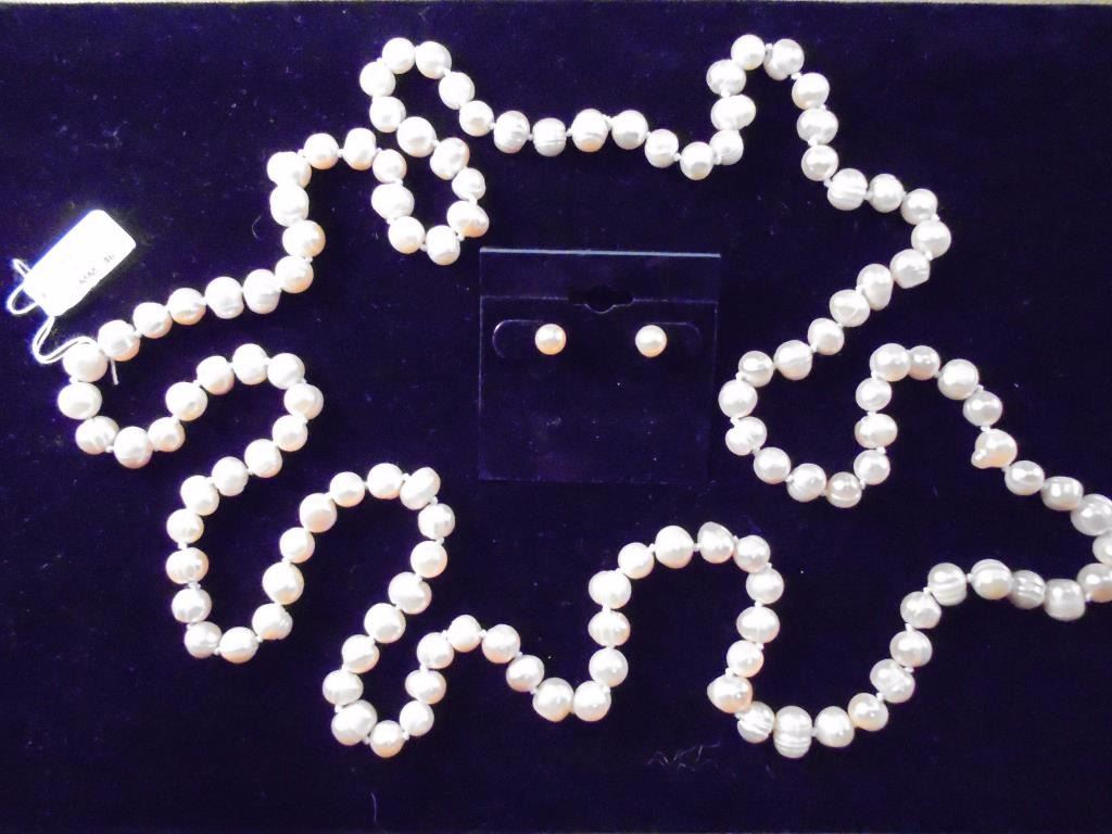 NECKLACE IS 46" 7-9MM PEARLS AND EARRINGS ARE  6-7MM PEARLS. RETAIL IS $160.00. WHITE/PINK  IN COLOR