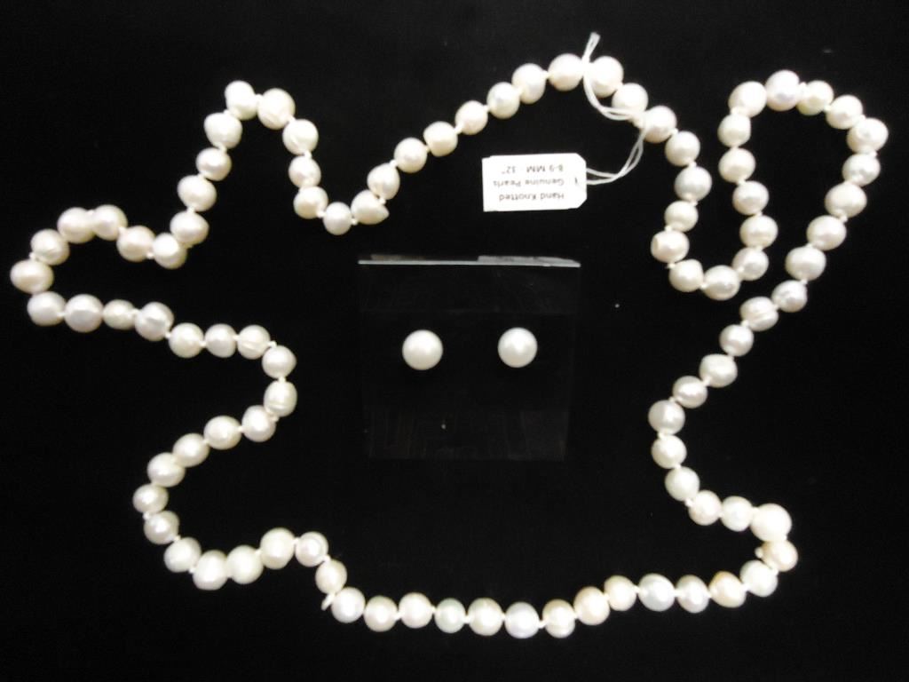 NECKLACE IS 8-9MM-32" LONG AND EARRINGS ARE 9-10MM STUD EARRINGS, RETAIL IS $360.00. WHITE IN COLOR