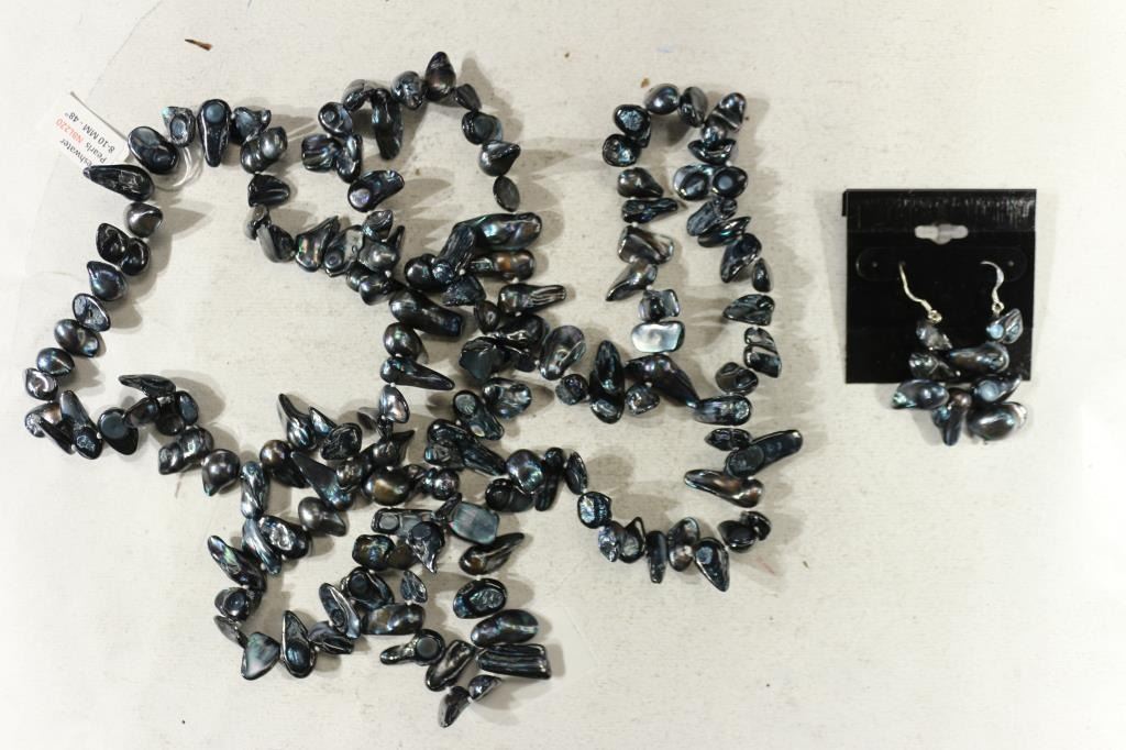 NECKLACE IS 48" DARK COLORED 8-10 MM PEARLS AND EARRINGS ARE 8-10 MM