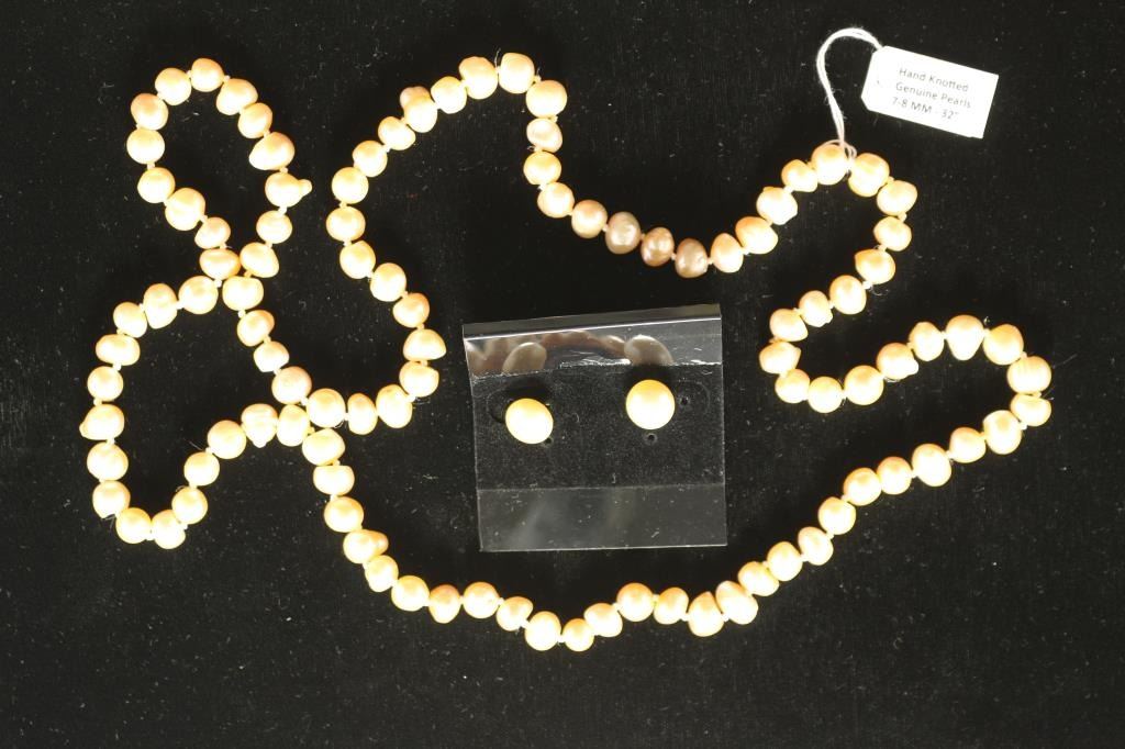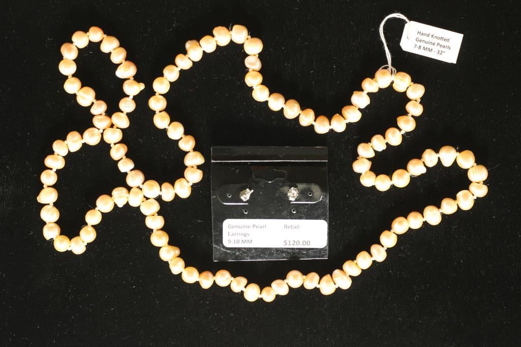 NECKLACE IS 32" (7-8MM) PEARL'S. POST EARRINGS (9-10MM). ALL PINK IN COLOR WITH A RETAIL OF $300.00