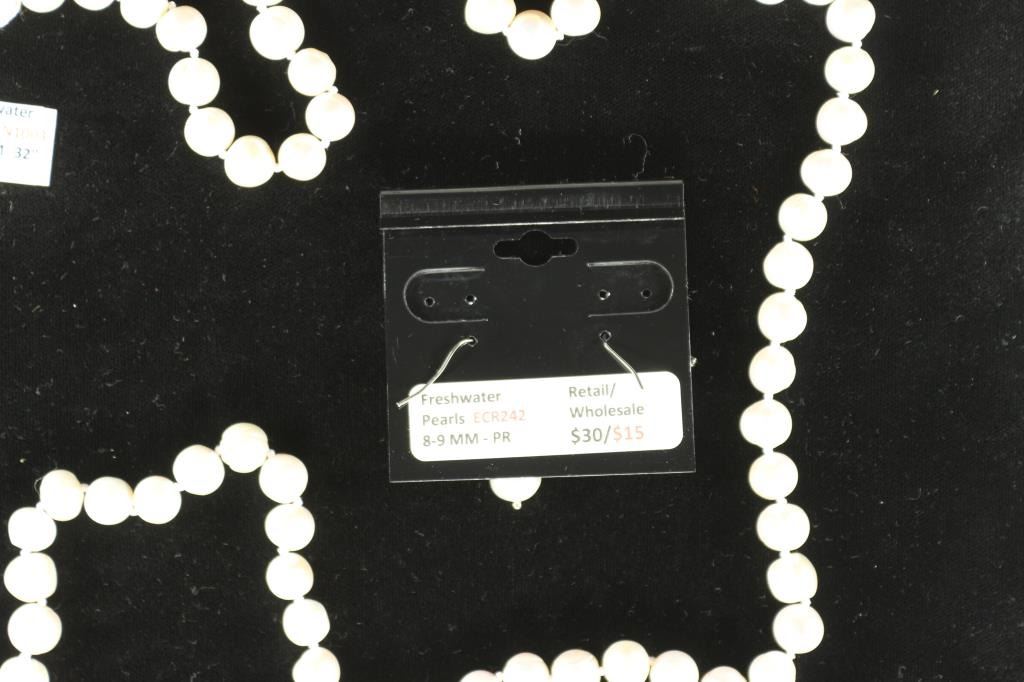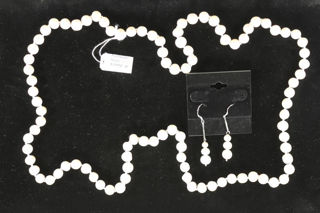 NECKLACE IS 32" (8-9MM PEARLS) AND HOOP EARRINGS ARE (8-9MM PEARLS), RETAILS FOR $150.00, WHITE IN COLOR