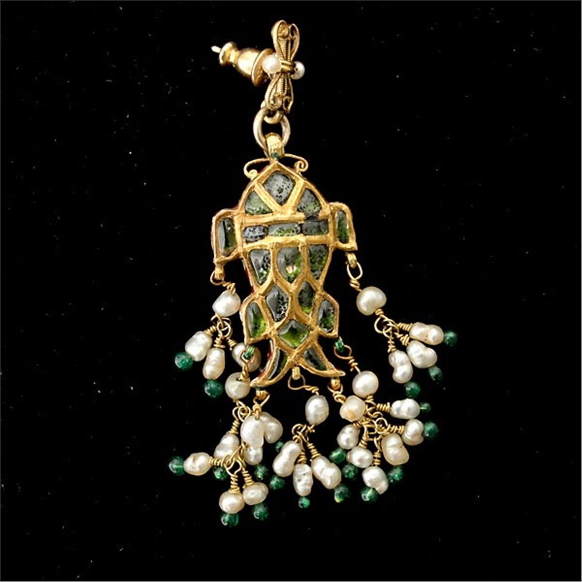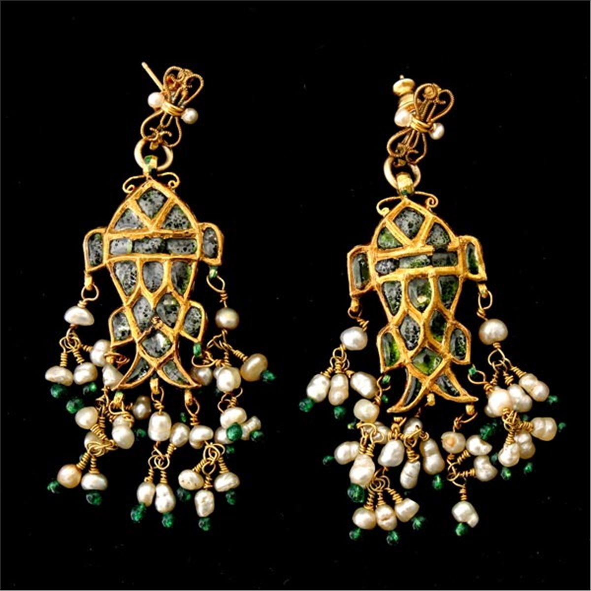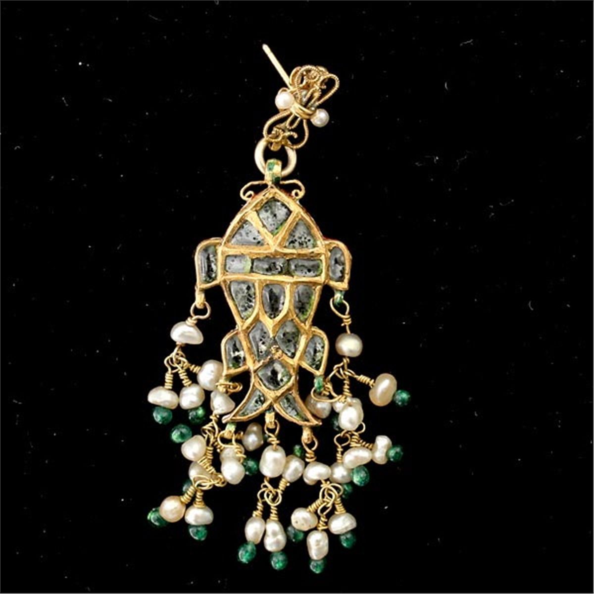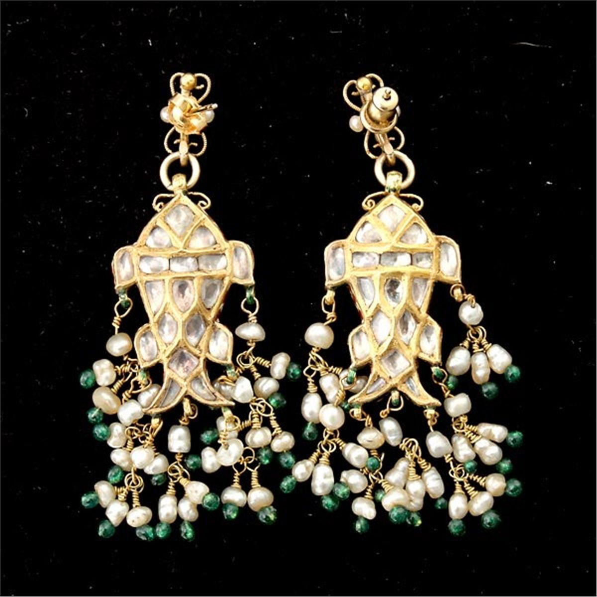 MUGHAL STYLE FRESHWATER CULTURED PEARL, ENAMEL, SILVER GILT EARRINGS. Featuring green, red, white and colorless enamel, adorned with numerous freshwater cultured pearls and green glass beads, completed by posts.