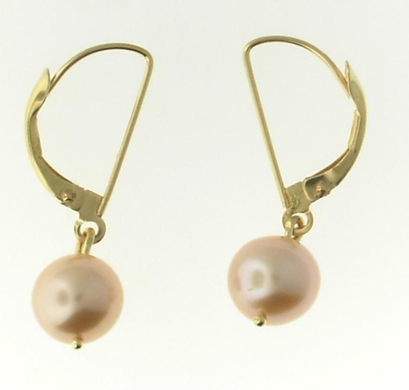 -pair of ladies drop dangle lever back stud earrings in 14K yellow gold, set with 2 near round freshwater cultured pearls.