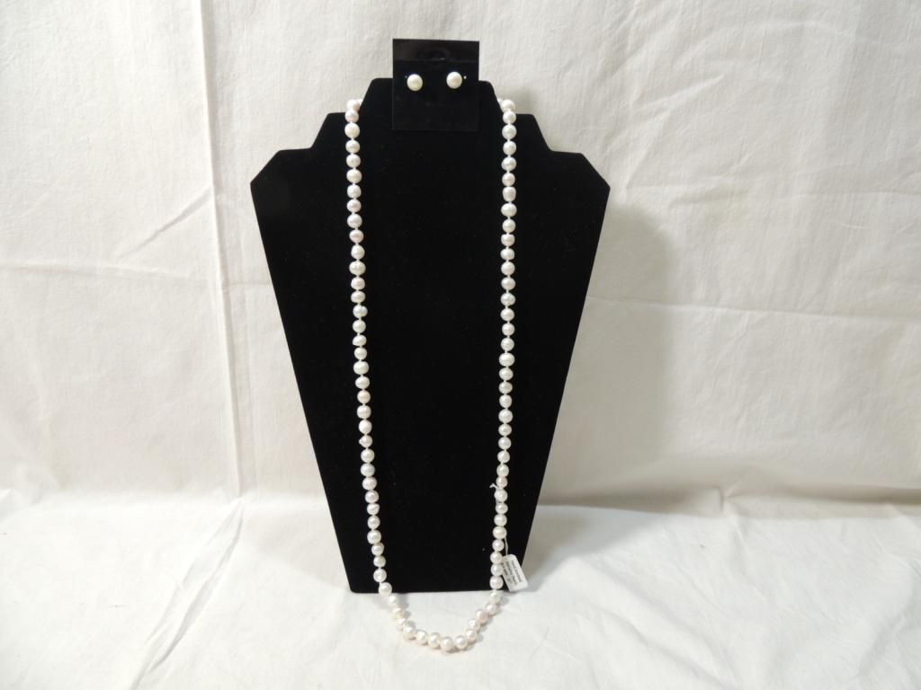 GENUINE PEARL NECKLACE AND EARRINGS. HAND KNOTTED. STUDDED EARRINGS. 8-9 MM 32" STRAND. AS SHOWN. SEE PHOTO FOR MORE DETAILS.