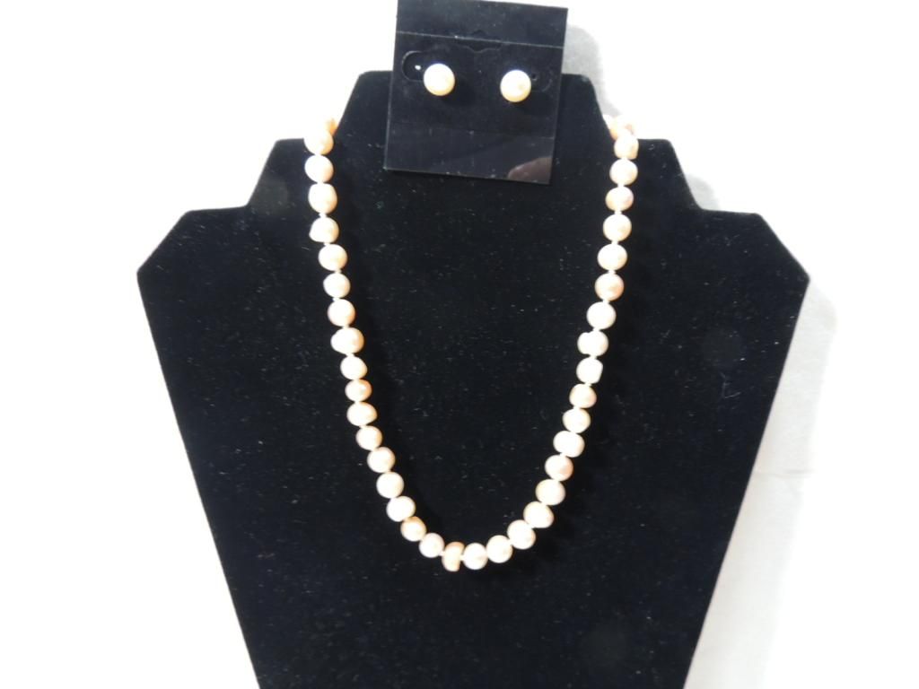 GENUINE PEARL NECKLACE AND EARRINGS. HAND KNOTTED PEACH PINK COLOR. 8-9MM 16" STRAND NECKLACE. GENUINE STERLING SILVER. AS SHOWN. SEE PHOTO FOR MORE DETAILS.