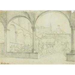Innenhof des Klosters der Kirche S. Croce mit Blick auf die Pazzi-Kapelle. Bleistiftzeichnung 1828. - <U>Signiert</U>, datiert “29. Juli 28” und ortsbezeichnet “St. Croce”. Auf chamoisfarbenem Vélin. Größe: 14,6 x 20,4 cm. Leicht gebräunt, gering stockfleckig und etwas angeschmutzt sowie mit kleiner Eckfehlstelle.