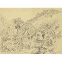 “Merzenbachthal bei St. Clemenskapel”. Fachwerkgebäude in baumbestandener felsiger Landschaft. Bleistiftzeichnung. - <U>Signiert</U> und betitelt. Auf bräunlichem Bütten. Größe: 30,2 x 40,4 cm. Gering gebräunt und mit vereinzelten Stockflecken. Ränder mit winzigen Beschädigungen.