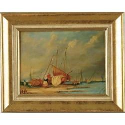 Lot # 133 FRIEDRICH KILIAN (European, 19th/20th Century) TENDING THE BOATS. Oil on wood panel scene shows several people next to beached boats on beach and shallow water. Signed lower right “F. Killian 09” with inscription. Reverse has artist’s name and possibly title with description dated June 1911. Wax seal affixed to back of panel. Housed in a gilt molded wood frame. SIZE: 8” x 10-1/2”. CONDITION: Very good with surface dirt. 9-98648 (200-400)