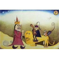 “Der tote Löwe”. Mischtechnik (Farbkreide, Blei- und Farbstifte) 1959. - <U>Signiert</U>, <U>monogrammiert</U>, datiert und betitelt. Auf Schoellerhammer-Vélin. Größe: 49 x 71 cm. Für den Künstler typisches Werk, in dem er Phantasiegestalten in Verbindung mit Tieren, besonders dem Löwen, zeigt. Unter Passepartout und Glas gerahmt.