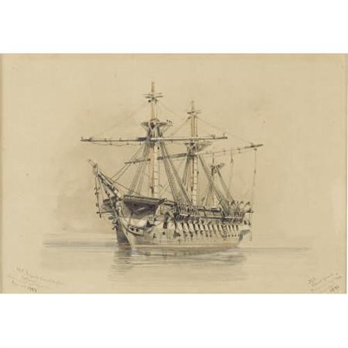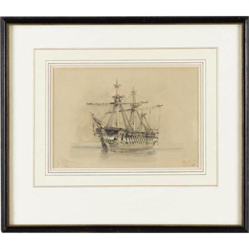 <B>THE FRIGATE </B></I><B><I>CONSTITUTION</B></I></B></I><B>, A GOUACHE PAINTING BY SAM SMITH, 1871</B></I>. The U.S.S. <I>Constitution</B></I>, affectionately called "Old Ironsides" because shells seemed to bounce off its sides, was commissioned by the Naval Act of 1794 and was launched in 1797 from Boston Harbor. Made of 7" thick Georgia live oak reinforced by fittings made by Paul Revere, the ship is the oldest active naval vessel afloat. This fine gouache, almost monochromatic, but reflective, is a nice homage to the most famous ship of the United States Navy. In pen on painting <I>U. S. Frigate Constitution 44 guns launched at Boston Sep 20 1797, H. S. Navy Yard Philadelphia Sept 30th 1871</B></I>. Nicely matted and framed. <BR><B><BR>Provenance: </B></I><I>Tharpe Collection of American Military History</B></I><BR><BR><B>Exhibited: </B></I><I>The Liberty Heritage Society Museum.</B></I><B><BR><BR>Condition:</B></I> Excellent condition.<BR><BR><b>Shipping:</b> Framed - with Glass, Medium (<a target="_blank" href="http://www.heritageauctions.com/common/shipping.php">view shipping information</a>)
