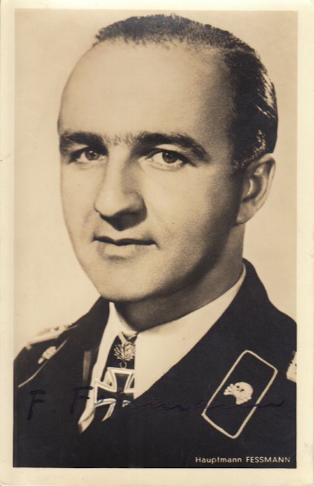 (1913 - 1944) German major, a Panzer tank officer awarded the Knights Cross with Oak Leaves, awarded his Swords after being killed in action when a Russian shell exploded nearby, hurling him against another vehicle. Rare S.P. 3 1/2" x 5 1/2" b/w, a Hoffmann photo postcard signed at bottom and addressed by Fessmann on verso. Fine. Sold with a S.P. 2 1/2" x 3 1/2" b/w portrait of fellow Knights Cross awardee FRIEDRICH-WILHELM BRIEDENBACH, signed at bottom.