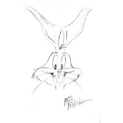 <b>1349. FRIZ FRELENG</b> (1906 - 1995) American artist and animator, creator of "Bugs Bunny", "Yosemite Sam", and a host of other Warner characters. Original pencil drawing on a 6 3/4" x 10 3/4" sheet of white heavy stock, a smiling image of Bugs Bunny signed at bottom. Fine. <b> $150-250</b>
