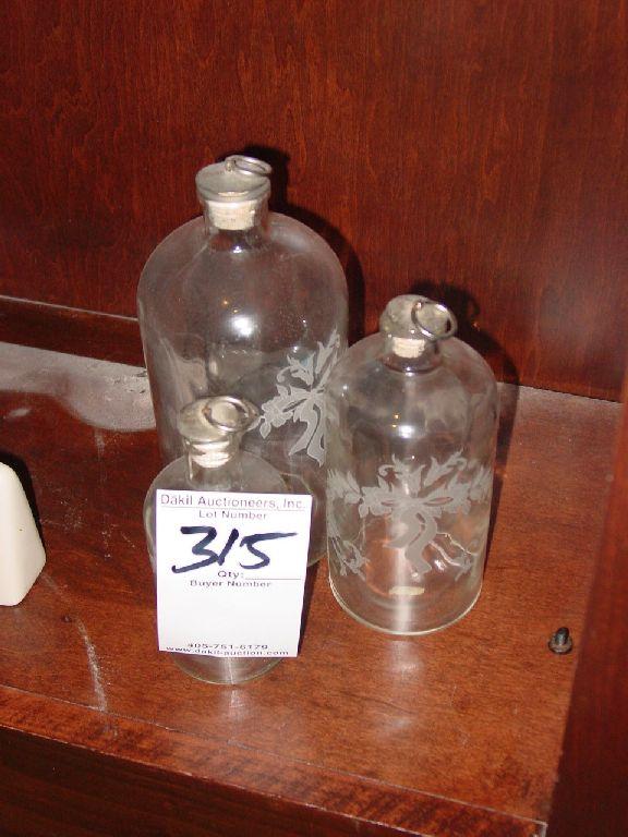 FROM PORTUGAL SET OF DECORATIVE ETCHED GLASS BOTTLES WITH CORKS (3X)