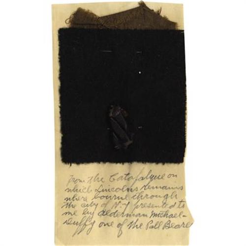 <B>BUNTING FROM THE CATAFALQUE OF PRESIDENT ABRAHAM LINCOLN, NEW YORK CITY, 1865.</B></I> This is a very rare, historical, and poignant relic of President Lincoln’s slow trip back to Springfield, Illinois following his assassination. This piece of silk bunting cord, 1.25” x .5”, is from Lincoln’s catafalque in New York City. Written in noted collector Al. Emmett Fostell’s own hand: “<I>from the Catafalque on which Lincolns </B></I> sic <I>remains where bourne through the City of N. Y. presented to me by Alderman Michael Duffy one of the Pall Beare</B></I> rs ”<I>. </B></I>A rare and exceptionally impressive Lincoln item. <BR><B><BR>Provenance: </B></I><I>Al. Emmett Fostell Collection</B></I><B><I> </B></I></B></I><BR><BR><B>Condition:</B></I> Very fine condition <BR><BR><b>Shipping:</b> Miscellaneous Collectibles, Smal (<a target="_blank" href="http://www.heritageauctions.com/common/shipping.php">view shipping information</a>)