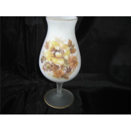 WHITE FROSTED GLASS ON TOP WITH EARTH COLOR FLOWERS. THE BOTTOM TWISTED DESIGN STEM IN A FROSTED COLOR. GOLD TRIM AROUND ON TOP AND BOTTOM.11 INCHES TALL.