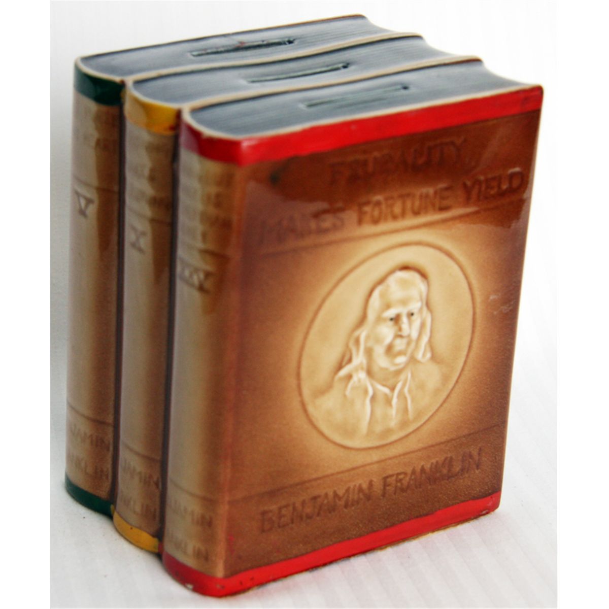 FRUGALITY MAKES FORTUNE YIELD’, Benjamin Franklin. Shape of three books together, with portrait of Franklin in relief. Three coin slots at top. No key or serial number. 10cm x 13cm x 8cm. Ceramic, in shades of brown. Maker unknown. No patent information. VF.