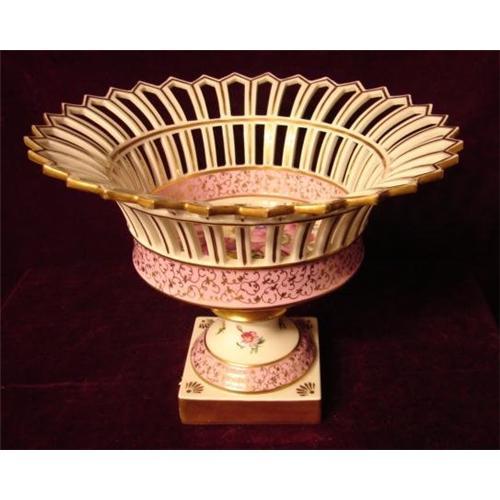 Circa 1875 Reticulated Footed Pedestal Based Compote. Decorated with a pastel floral spray. Hand Painted in shades of pink,rose, blue and lavender with a hint of orange. The border decorated with a pink band having gilt scrolling.