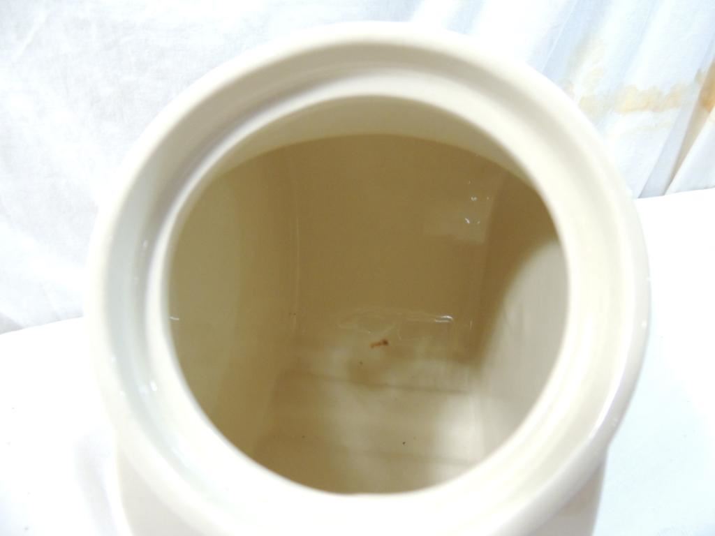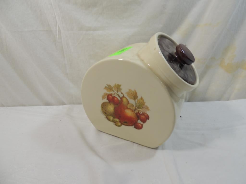 FRUIT FESTIVAL PATTERN VINTAGE MCCOY POTTERY COOKIE JAR KITCHEN CANISTER CERAMIC POTTERY AS SHOWN SEE PHOTO FOR MORE DETAILS.