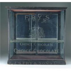 FRY’S CHOCOLATE ADVERTISING DISPLAY CASE. Features glass on all three sides with mirrored back door and glass shelves. Original Fry decoration on front with Fry monogram “Fry’s Choice Chocolates”. Case is also carved with advertising. SIZE: 28” w. x 26” h. x 15” d. CONDITION: Case is generally good condition, should be glued to tighten it up. Makes an excellent display case. 1-4683 (250-500)