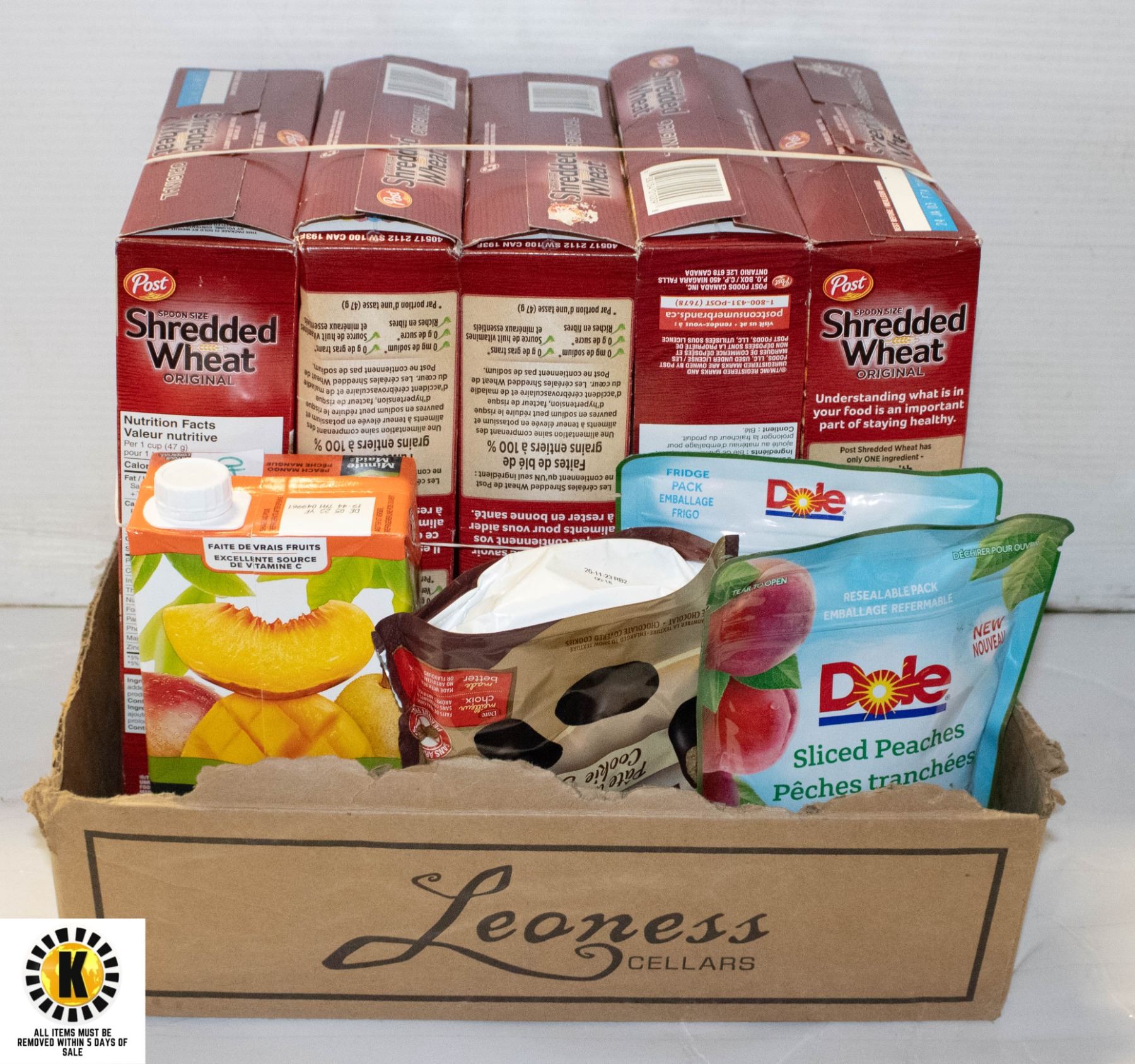 5 NEW BOXES POST SPOON-SIZED SHREDDED WHEAT 525G, 2 PACKS DOLE PEACH SLICES, MINUTE MAID 1L PEACH MANGO