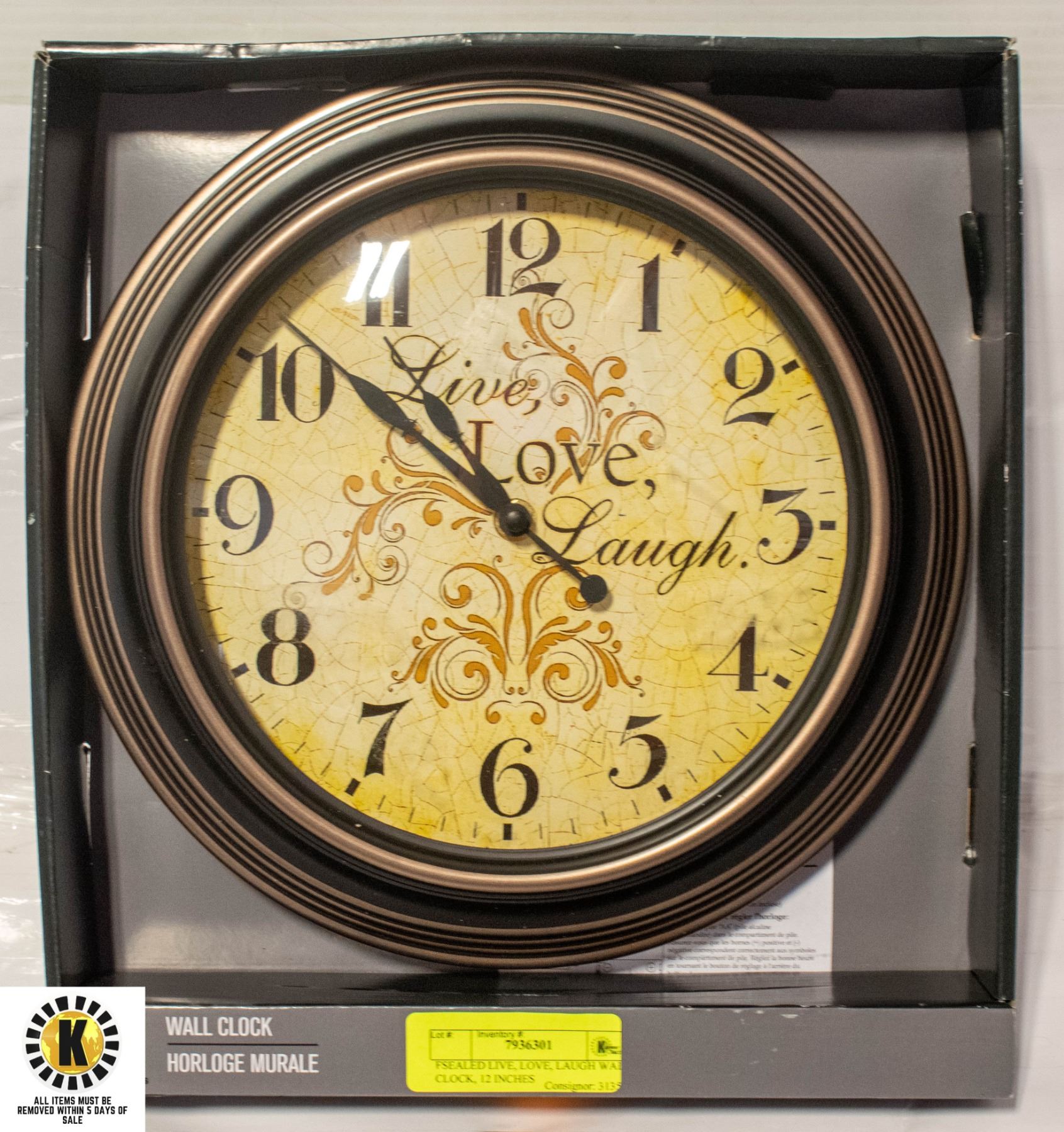 FSEALED LIVE, LOVE, LAUGH WALL CLOCK, 12 INCHES