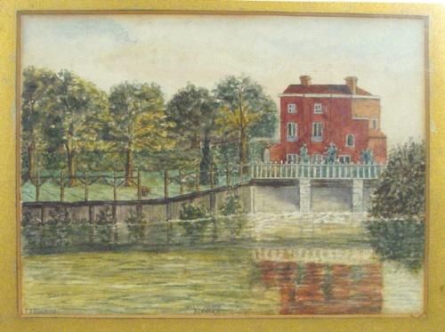 FT Fielding - Mill House Clewer - Watercolour study of a building beside a river, 13cm x 19cm