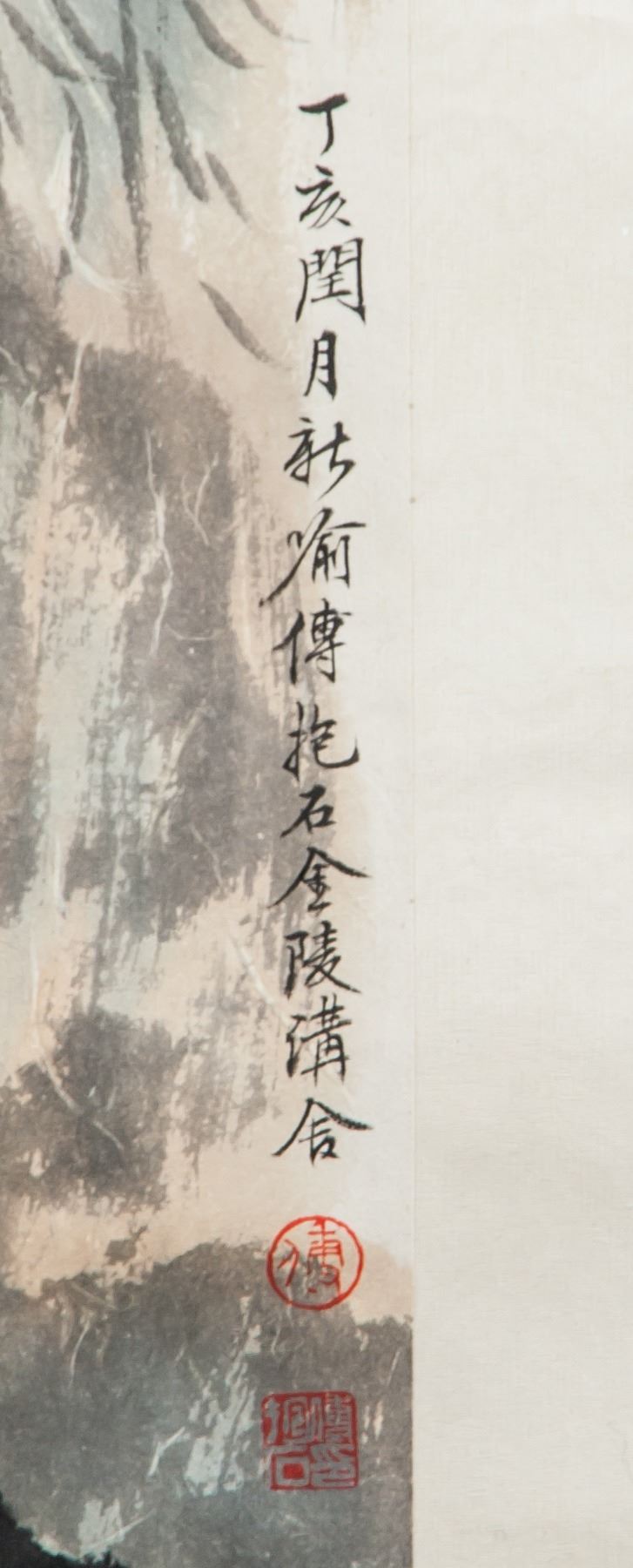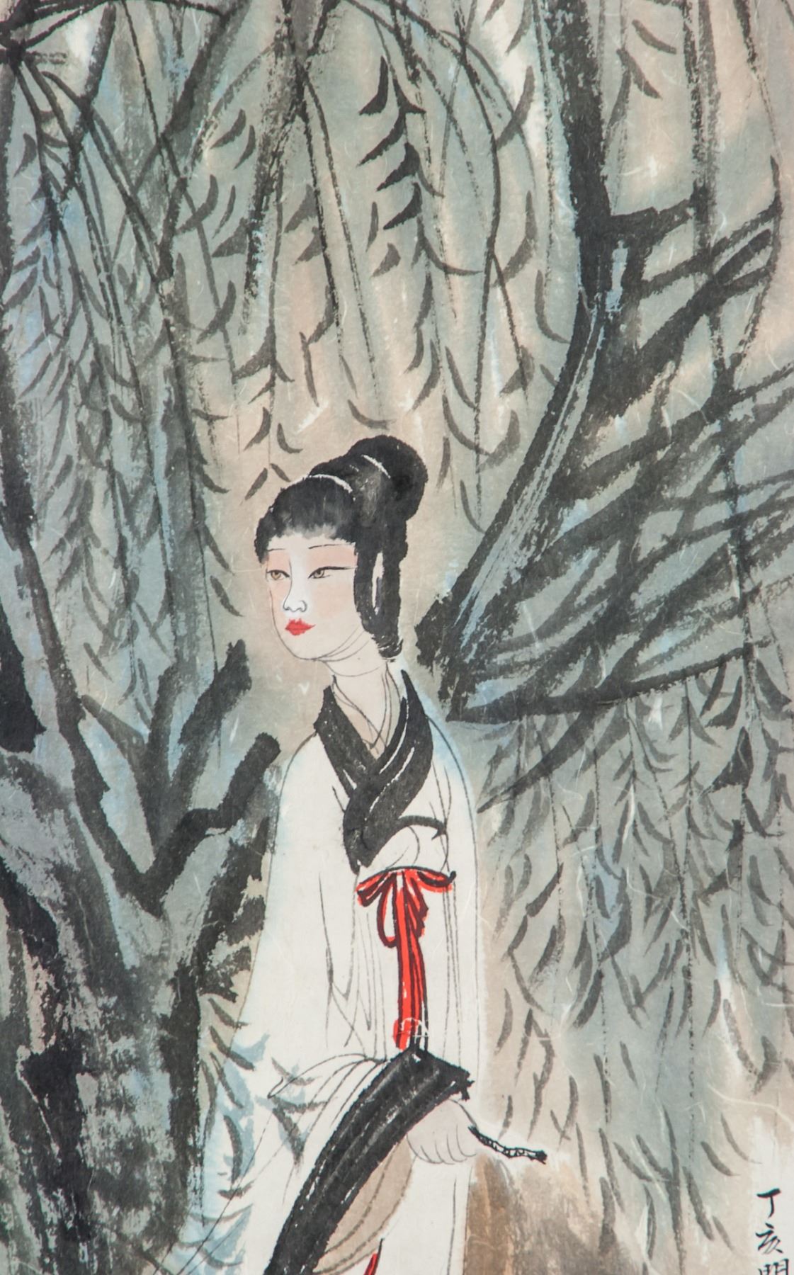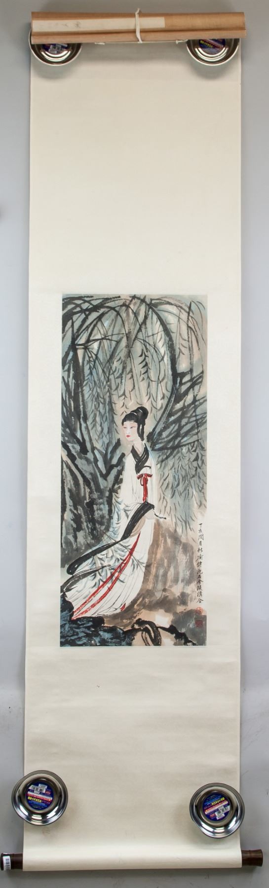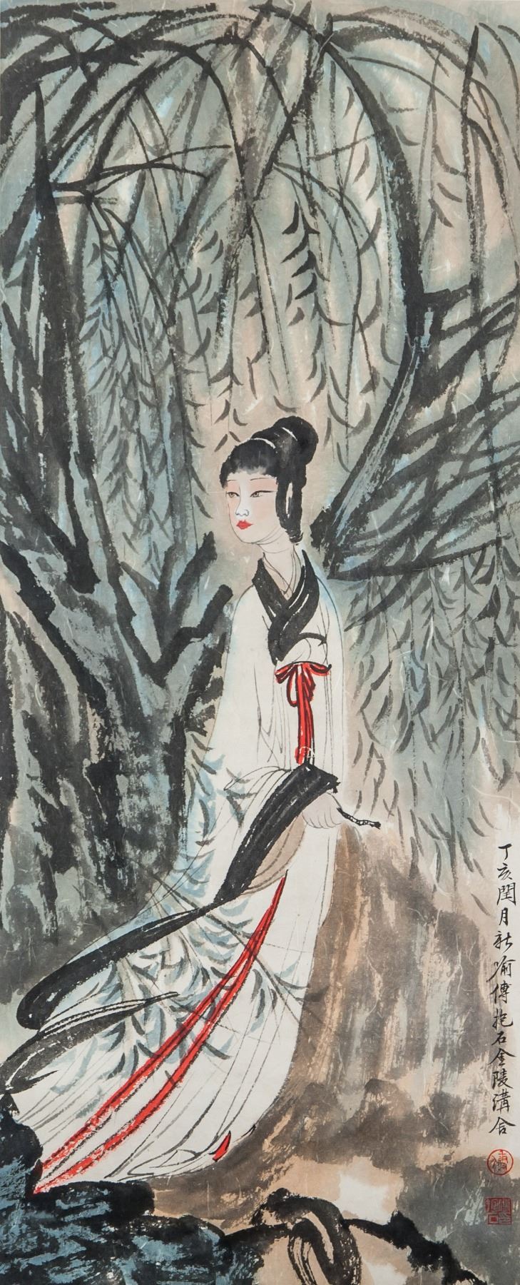 Watercolor and ink on paper, hanging scroll, featuring standing beauty under willow, signed and attributed to Fu Baoshi (Chinese, 1904-1965), inscribed with 2 artist seals, 69.5 x 29 cm, Fu Baoshi was a Chinese painter known for both his depictions of landscapes and figures. In his devotion towards painting landscapes, Fu expressed himself with distinctive brushstrokes and splattered marks. During his career, Fu’s subject matter changed from traditionally dressed figures in misty forests to power lines and airports. Today, Fu’s works are held in the collections of the Metropolitan Museum of Art in New York, the Long Museum in Shanghai, and the Cleveland Museum of Art, among others.