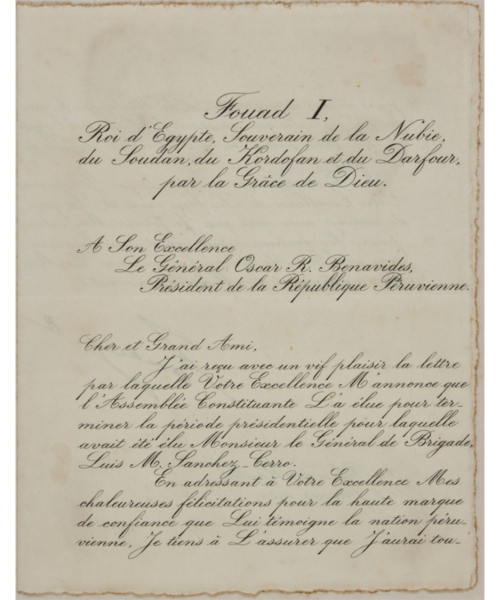 (1868 - 1936) Sultan (1917- 1922) and later King of Egypt and Sudan (1922 - 1936). L.S., "Fouad I", as King, 2pp. 4to., [Cairo], Jan. 7, 1934 in French to Oscar Benavides, President of Peru congratulating him on his recent election as President of Peru, offering his condolences on the death of the former President, Luis Miguel Sanchez Cerro, and making assurances of continued good relations between Egypt and Peru. Blank leaf pasted to a larger sheet, usual folds, else very good.