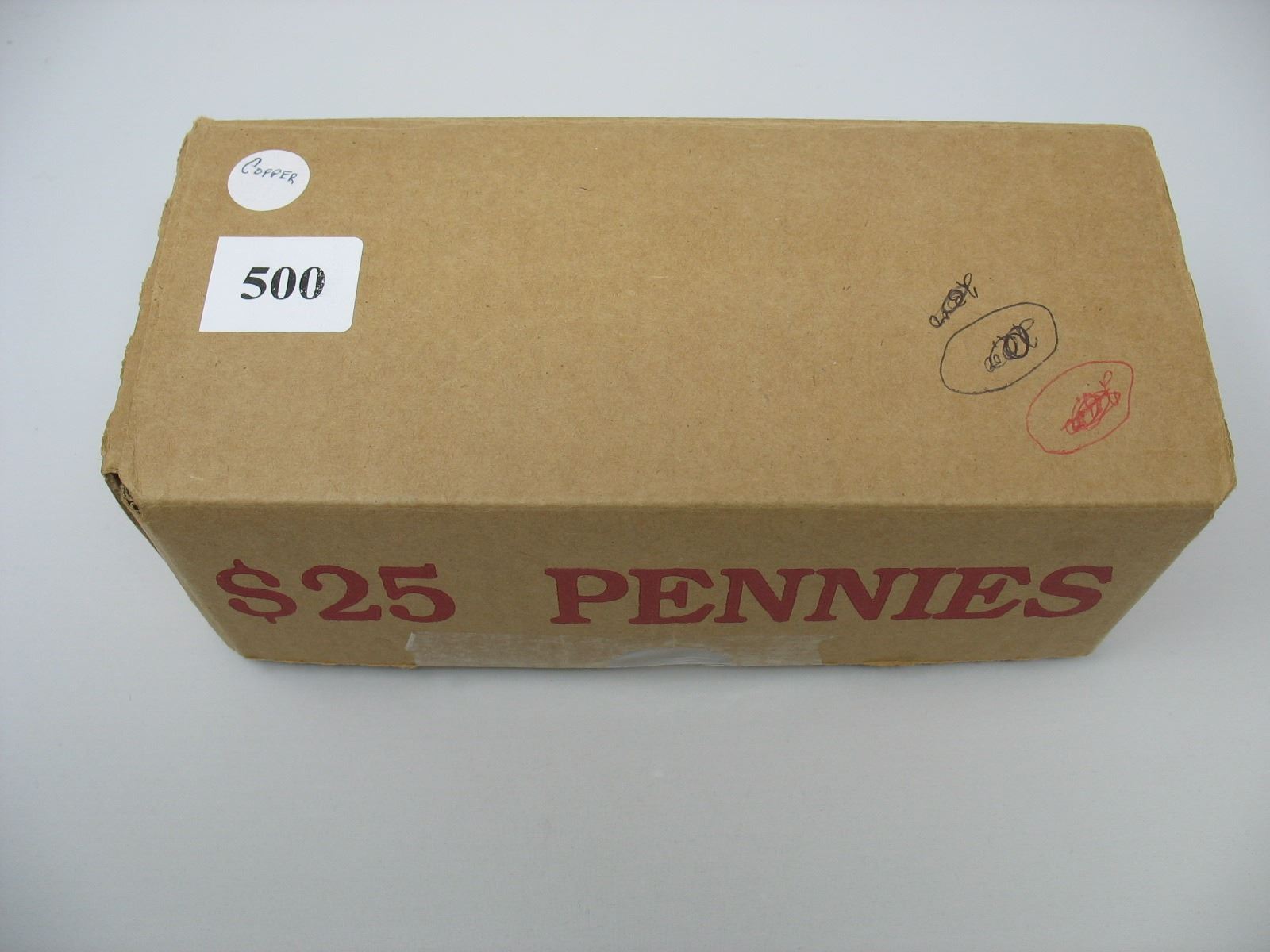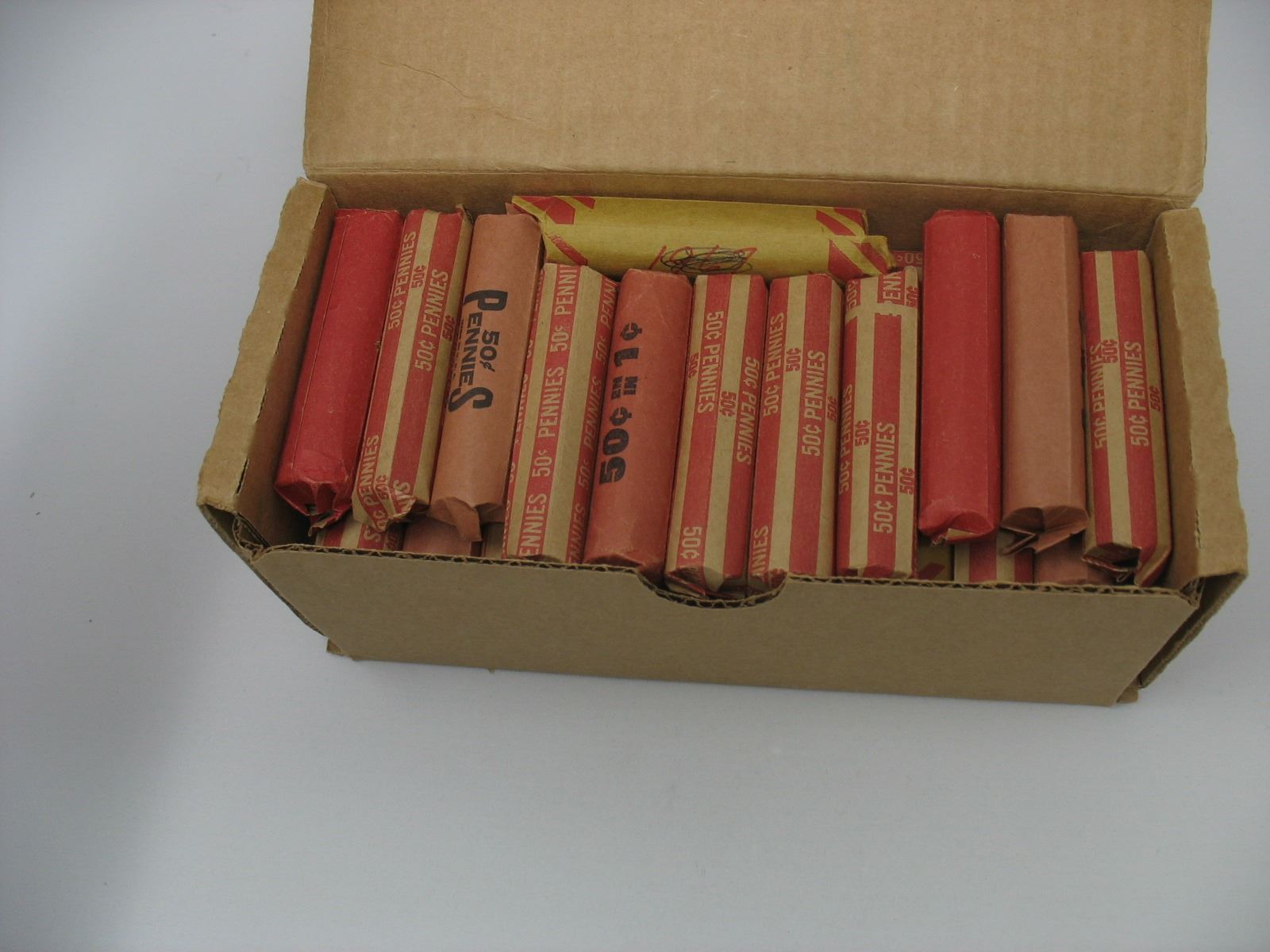 FULL BOX - $25.00 PENNIES (50 ROLLS) - ALL COPPER - Dated 1996 and older