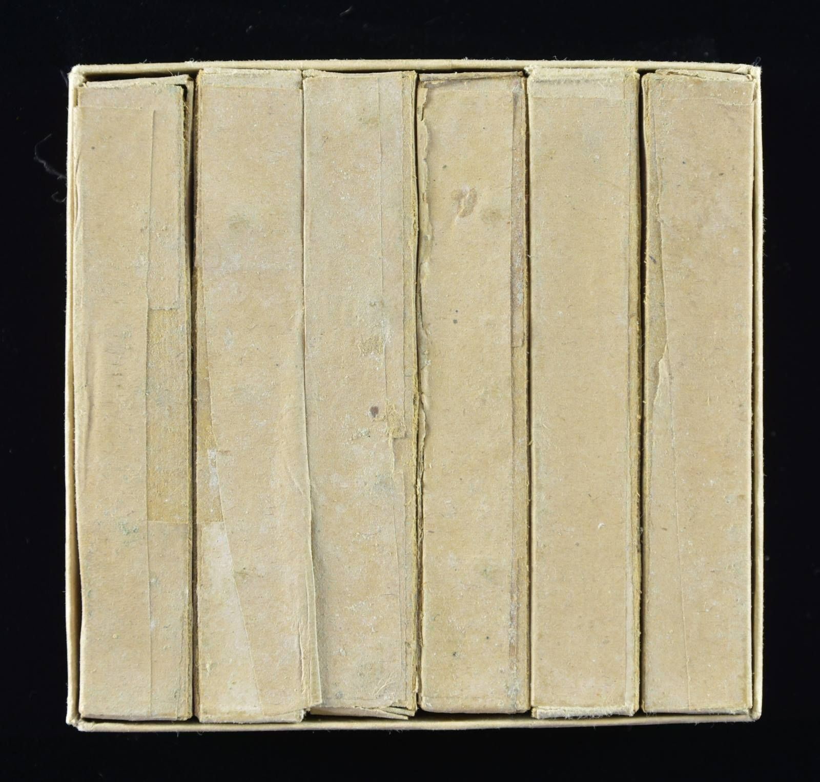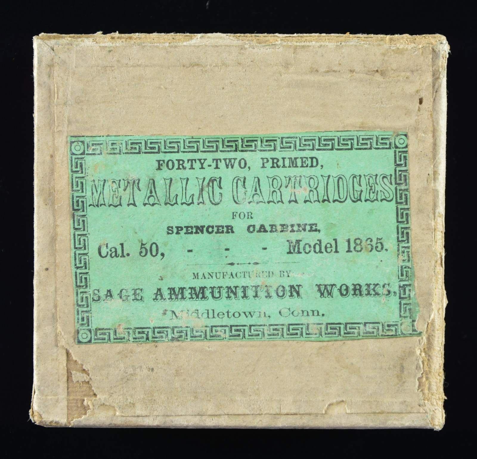 CALIBER SPENCER CARBINE. A fine full box of 50 caliber Spencer Carbine cartridges containing 42 rounds housed in 6 smaller cardboard boxes containing 7 rounds each. The box measures approx. 4 1/2” square and has a green paper label that reads “FORTY-TWO PRIMED METALLIC CARTRIDGES FOR SPENCER CARBINE, Cal. 50, Model 1865. MANUFACTURED BY SAGE AMMUNITION WORKS, Middletown, Conn.” CONDITION: the box shows wear but is substantially intact, and the label is quite clear and easily legible. PROVENANCE: From the Lifelong Collection of Glen E. Mattox. (02-18659/BF). $800-1,400.