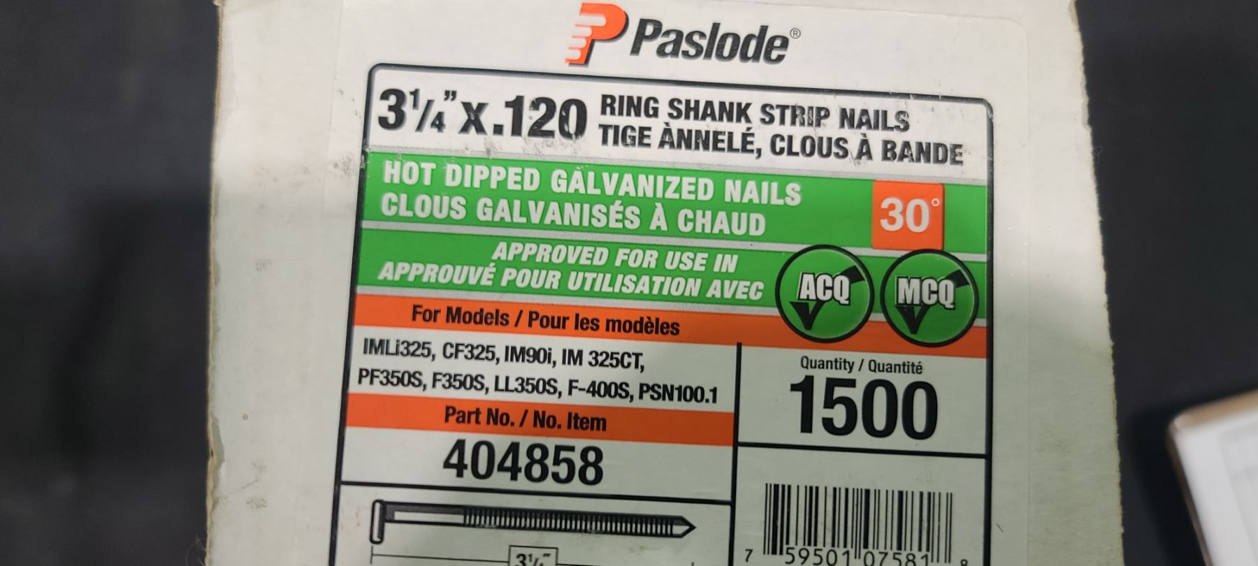 FULL BOX OF PASLODE 3 !/4" ROUND DRIVE STRIP NAILS AND PARTIAL BOX OF 3 1/4" RING STRIP NAILS