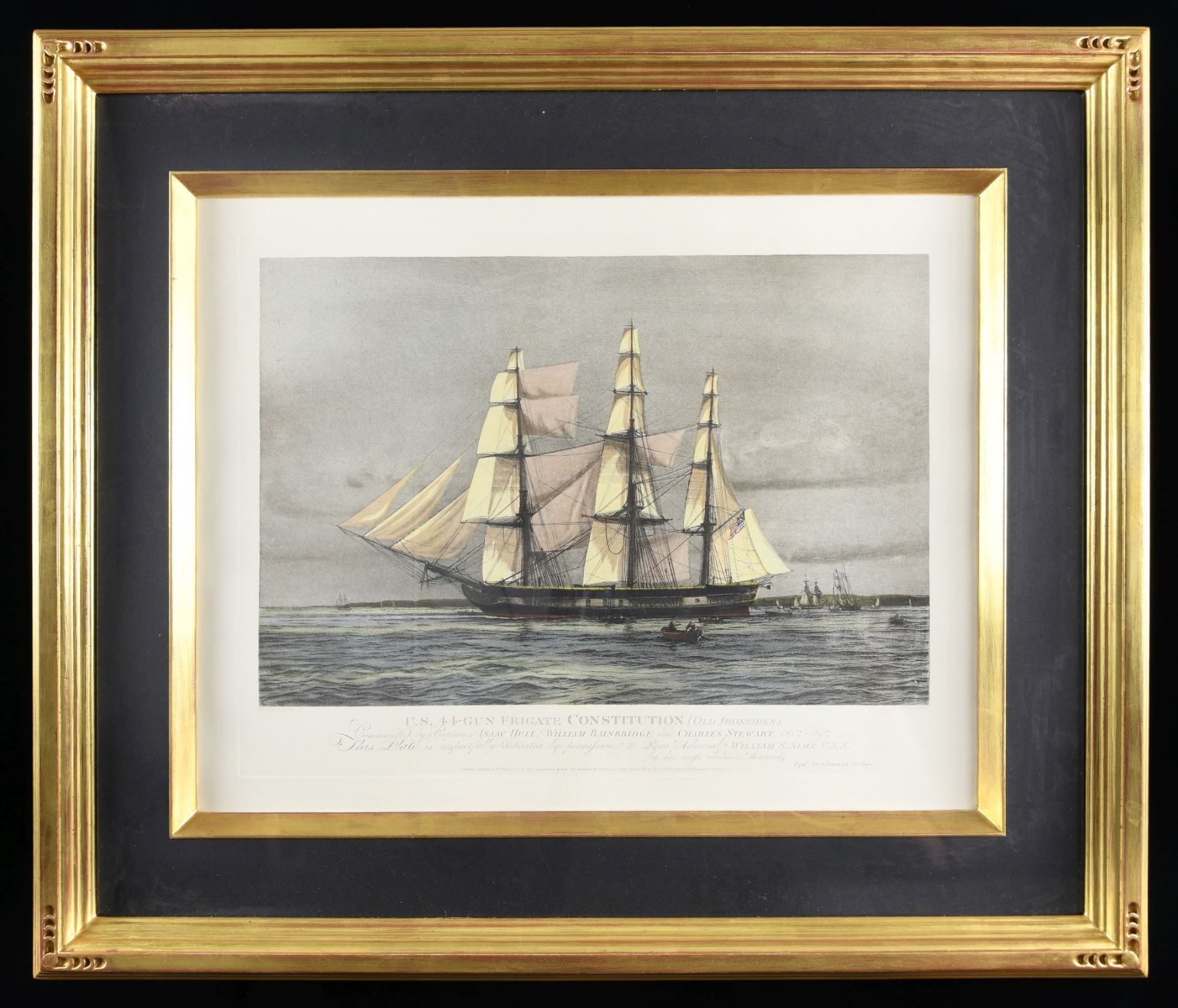 CONSTITUTION UNDER FULL SAIL. This fine engraving has a sight size of 23 1/4" x 18" and is housed in a period appropriate gold leaf frame measuring 33" x 27 1/2". The engraving is titled at the base "U.S. 44 GUN FRIGATE CONSTITUTION (OLD IRONSIDES)". The base further reads "Commanded by Captain ISAAC HALL, WILLIAM BAINBRIDGE and CHARLES STEWART 1812 - 1815. This Plate is respectfully dedicated by permission to Rear Admiral WILLIAM S. SIMS, U.S.N. by his most obedient servants ROBT. DUNTHORNE & SON." The credit line at the extreme bottom reads "LONDON Published 1st.. May 1924 by Robt. Dunthorne & Son, The Rembrandt Gallery, 5.Vigo Street, W. & The F. H. Bresler Co. Milwaukee, Wis. U.S.A." The engraving depicts the famous USS Constitution at full sail in calm waters with land and ships in the background. CONDITION: the engraving is in near mint condition and the frame shows only the slightest handling wear. (02-23517/BF). $500-1,000.