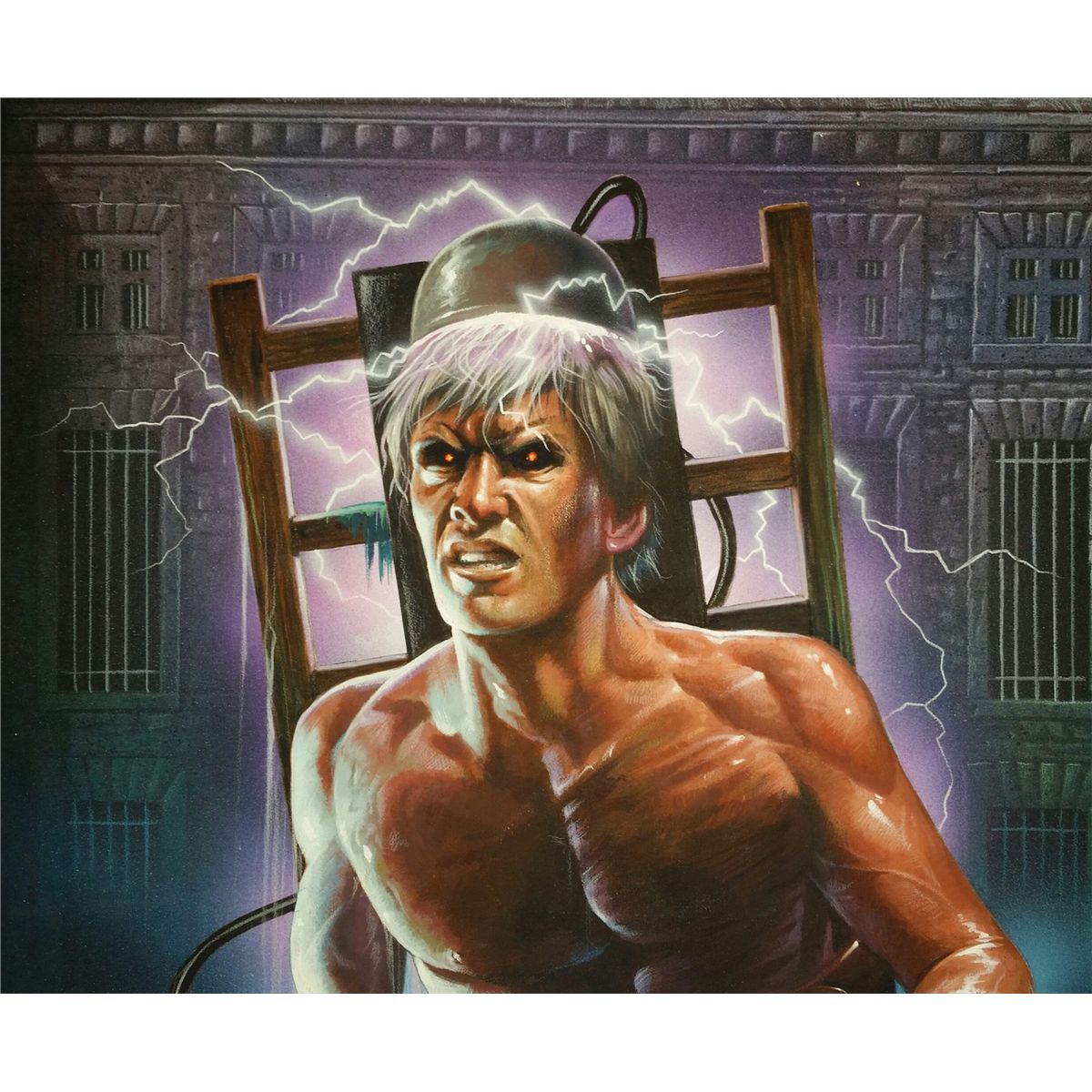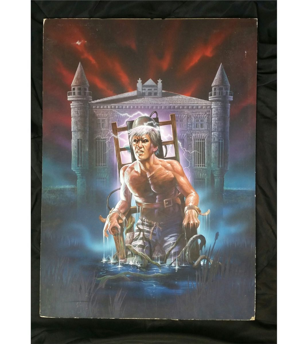 Original theatrical poster art for the 1987 Empire Pictures film Prison starring a young Viggo Mortensen and featuring early appearances by Tommy “Tiny” Lister and Kane Hodder. Artwork features Mortensen’s character Charlie Forsythe being executed in an electric chair in front of the film’s eponymous Creedmore Prison. This artwork did not end up being used as the final theatrical poster, but more explicitly illustrates the plot of the movie than the final art.