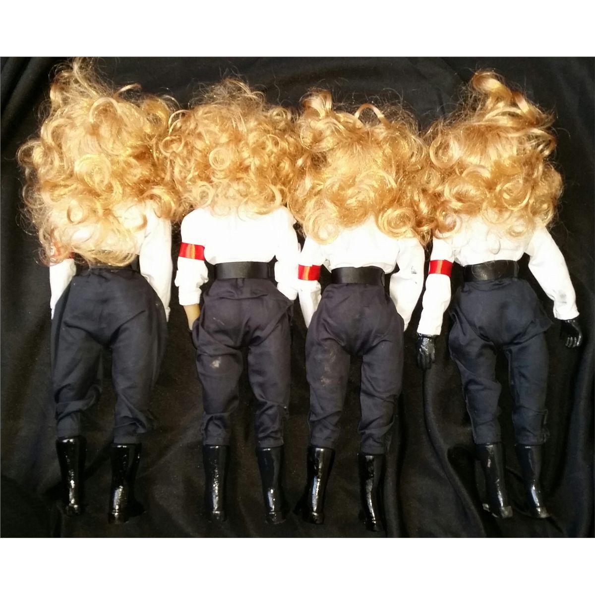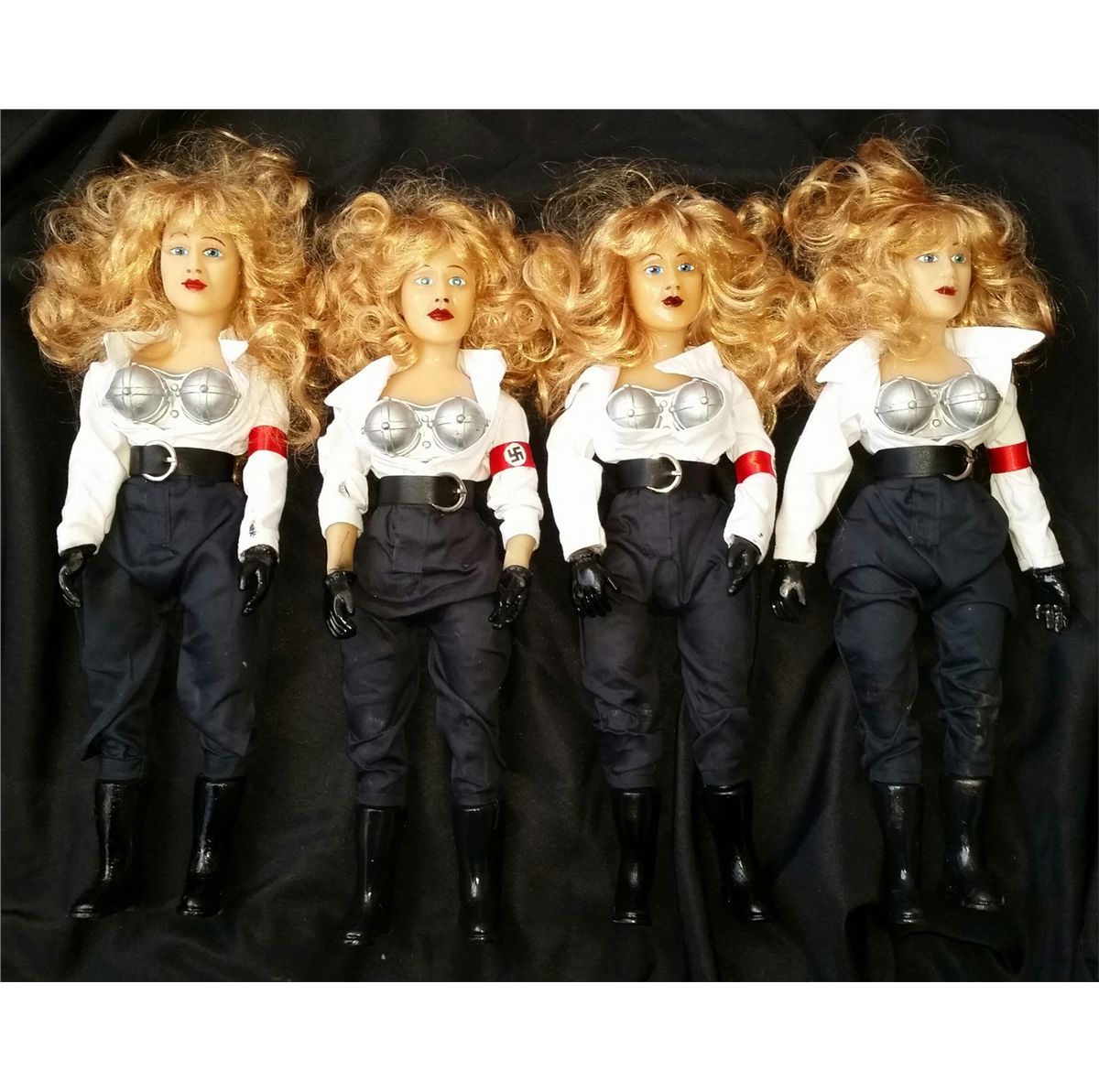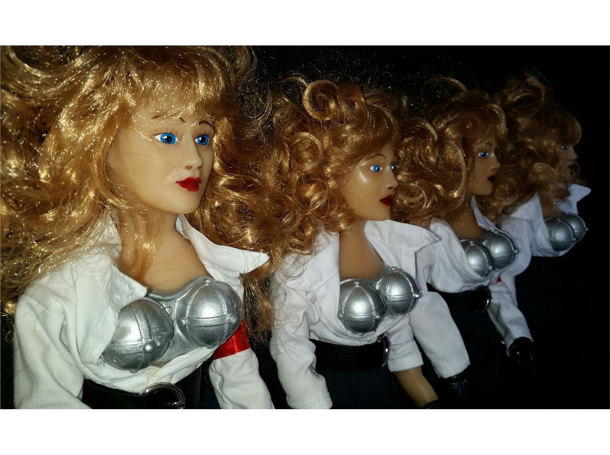Lot of four Bombshell 1:1 Scale Replicas from the movie Puppet Master X: Axis Rising. Each replica stands approximately 16" tall and 4" wide and includes a white replica display stand (total of 4). Replicas are used and have been slightly damaged. See photo for more details on the extent of the damage to each replica.