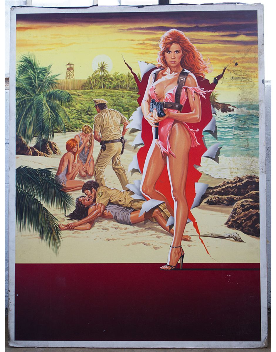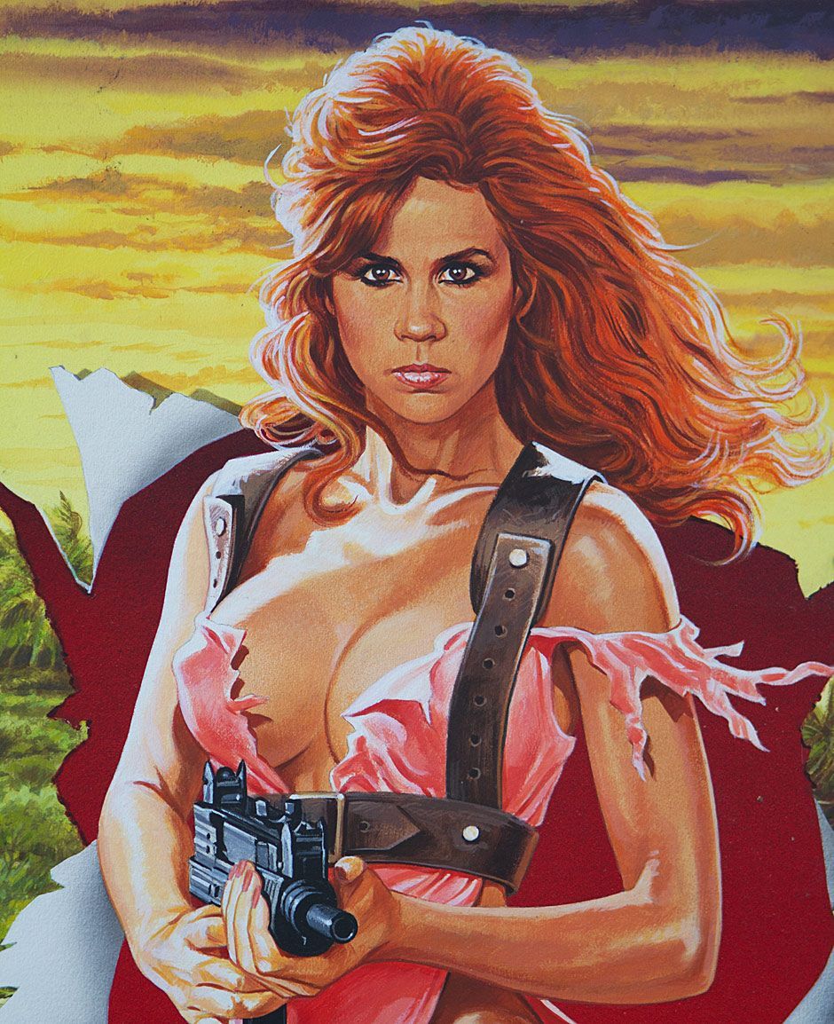 Original painting for the cover art of the 1985 VHS release of Savage Island, illustrated by Lawrence M. Salk. Now available under Full Moon’s Grindhouse Collection, Savage Island’s Linda Blair (The Exorcist, Scream, Hell Night) takes on the cover as a babe with a mission. A must have for any fan of classics grindhouse and exploitation films! Painting is in good condition with some wear and water marks around the edges.