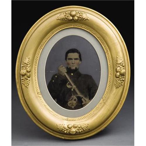 <B>FULL PLATE TINTYPE ARMED CIVIL WAR UNION SOLDIER CIRCA 1860S.</B></I> This beautiful hand tinted tintype has a young unidentified Union Civil War soldier with pink cheeks & gilded buttons, sitting in a studio with a very stern look. The photographer has caught this intense expression. He is holding a sword cased in scabbard and a percussion revolver stuck in his belt just behind his U.S. gilded belt buckle. It is matted & mounted in an early gilded oval frame, perfect for hanging. 12’ x 14”. <BR><BR><B>Condition:</B></I> Very fine, frame has a couple of small chips.<BR><BR><b>Shipping:</b> Framed - without Glass, Small (<a target="_blank" href="http://www.heritageauctions.com/common/shipping.php">view shipping information</a>)