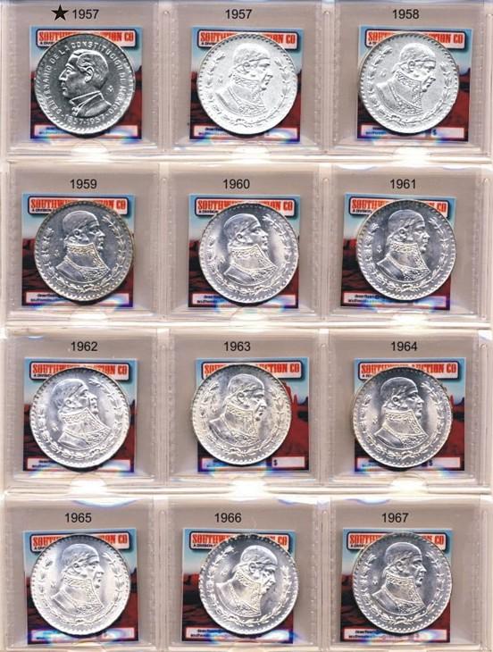 Note: Mint mark Mo.INCLUDES THE ONE TIME MINTING OF THE 1957 ORIGINAL UN PESO 100TH ANNIVERSARY COIN