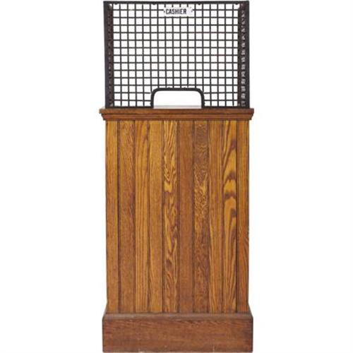 <B>OAK BANK TELLER CAGE/CASHIERS CAGE CIRCA 1890-1920</B></I> - This very impressive oak teller's cage, from an un-disclosed bank is a beautiful item. This complete oak teller's cashiers cage, measures 42”x 26.5”x20”. Teller cage on top 24.5”x 18”x 18”. Enamel (Cashier) sign not original to item. To complete this Bank display it has many counter top iron work items. Dimensions of counter top iron work, 60” x 26”. (2) 30” x 27” (1) 27” x 40” (door: 28” x 66” cage: 38” x 62”) (1) 31” x 48” (1) 56” x 27” (1) 100” x 27” (1) 48” x 60”.<BR><BR><B>Condition:</B></I> Very Fine complete item.<BR><BR><b>Shipping:</b> Requires 3rd Party Shipping (<a target="_blank" href="http://www.heritageauctions.com/common/shipping.php">view shipping information</a>)