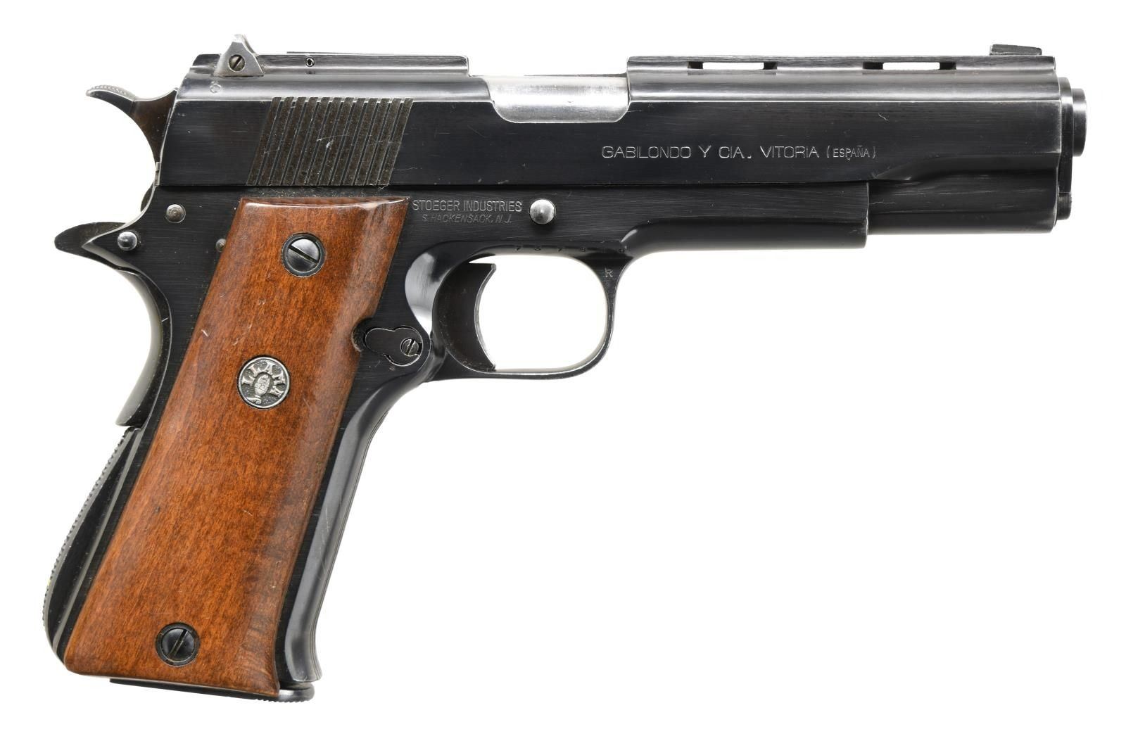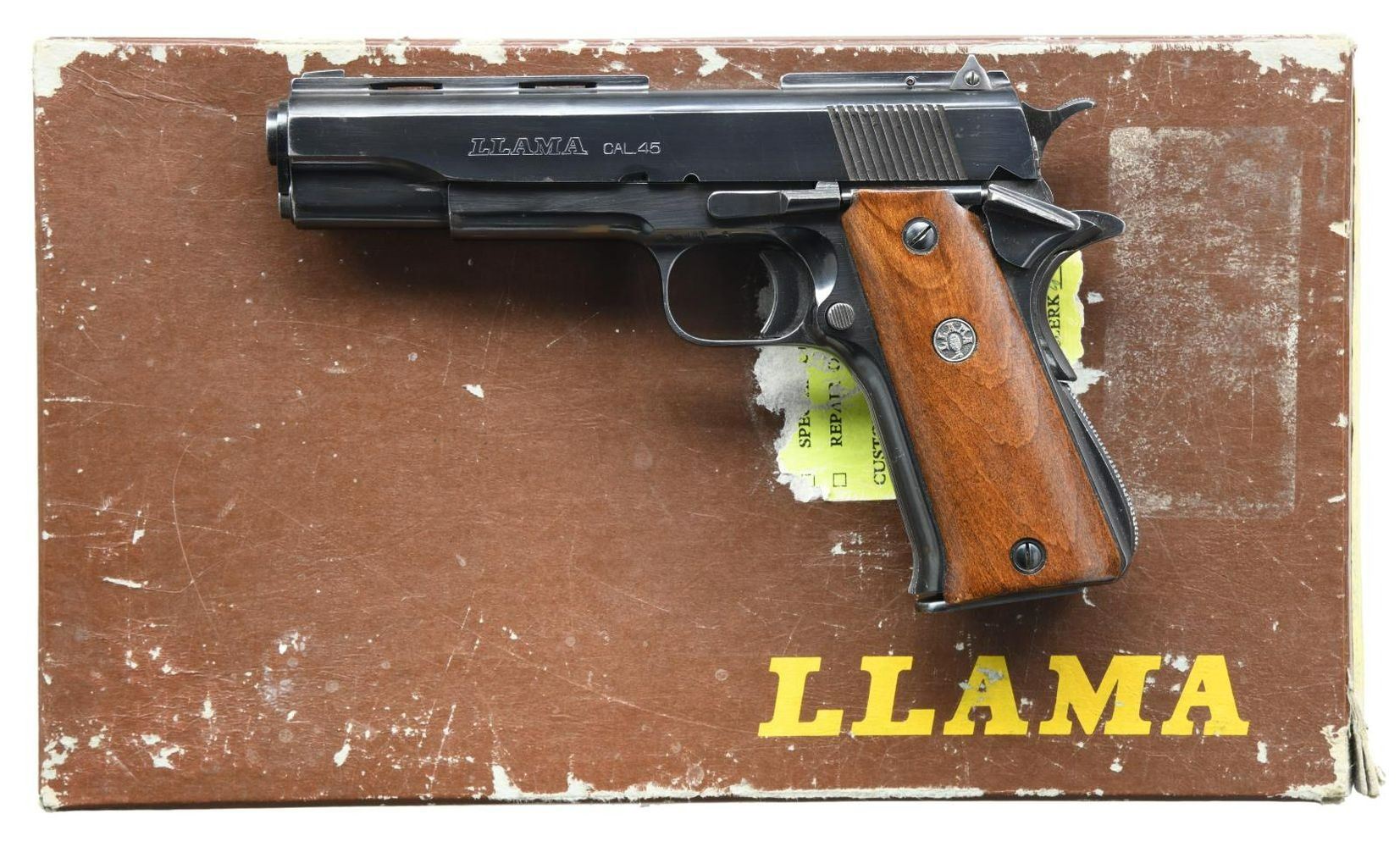 Cal. 45 ACP. S# 737849. Bbl. 5". Full size 1911 variant marketed as the Llama Automatic Pistol. Blued finish. Rear serrated slide w/ serrated vent rib. Fixed blade front & adjustable rear sights. Serrated hammer spur. Left side controls. Backstrap grip safety. Serrated front strap. Checkered backstrap. Serrated trigger. Imported by Stoeger Industries. Hardwood grips w/ Llama medallion. MAGS: 1 factory 7 rd. UNATTACHED ACCESSORIES: Factory cardboard box. CONDITION: original finish coverage complete & consistent w/ some gentle thinning on high spots & a few light handling scratches. Grips have some light impressions, retaining clear medallions. Factory box has 1 flap cut on the corners but still attached at top. Bore is bright w/ strong rifling. (23-5144/JZ). MODERN. $300-500.