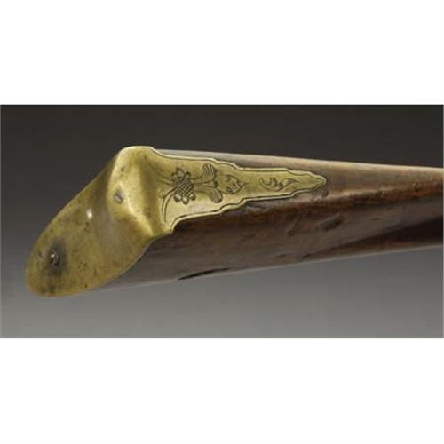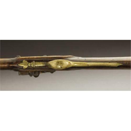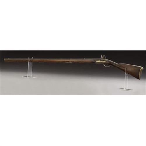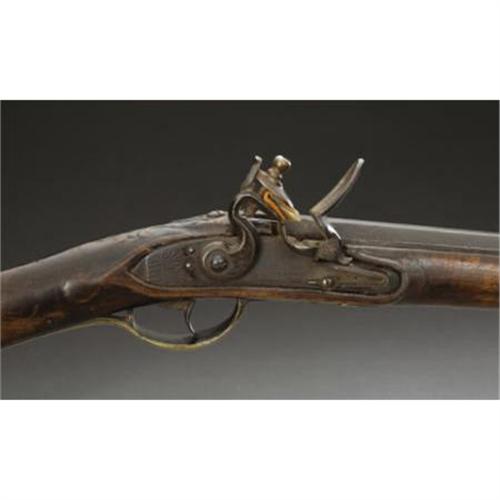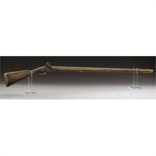<B>FULL STOCK FLINTLOCK RELIEF CARVED PENNSYLVANIA-STYLE RIFLE.</B></I> With 42" barrel, 57 ½ " long overall. The gun appears to have been made in the last quarter of the 18th century. The lock is marked “M-M-Maslin Warranted”. The rear 13" section of the barrel is octagonal with the balance round. All brass mounted, including the 4 brass barrel keys. Engraved lockplate, sideplate, buttplate, and rear sight. No patchbox.<BR><BR><B>CONDITION: </B></I>Stock has been sanded and refinished. A 6¾" section of wood has been replaced at the muzzle. Two large gouges on right buttstock. Some wood repairs at lock area and a nicely repaired crack at wrist. Brown patina on iron parts, with pitting at breech. Light mustard patina on brass parts. The rear tang screw is a replacement. Action functions. Possibly a well-done reconversion.<BR><BR><b>Shipping:</b> Requires 3rd Party Shipping (<a target="_blank" href="http://www.heritageauctions.com/common/shipping.php">view shipping information</a>)