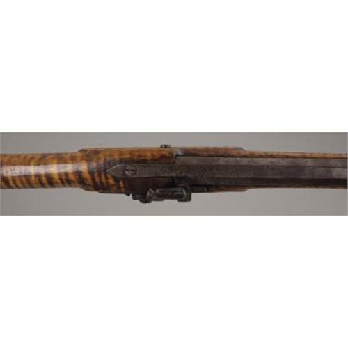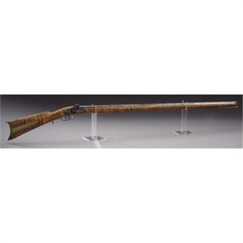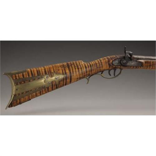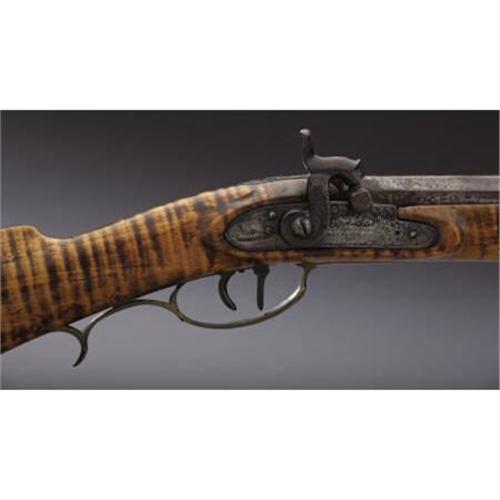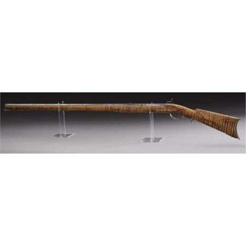 <B>FULL STOCK KENTUCKY RIFLE.</B></I> Unmarked 41," .32 caliber octagon barrel. Circa 1860s. Lock plate stamped, "Warranted" with minimal engraving. Ornate patch box with two piercings. All mounting of brass. Non-functioning double-set triggers. Full-length maple stock with attractive striping. <BR><BR><B>Condition:</B></I> Metal surfaces have a pleasing patina. Typical pitting of breach of barrel and on face of lockplate. Stock has been lightly cleaned but not at all offensive. Small chip at toe of stock.<BR><BR><b>Shipping:</b> Bats, Clubs, Sticks, Swords, Rif (<a target="_blank" href="http://www.heritageauctions.com/common/shipping.php">view shipping information</a>)