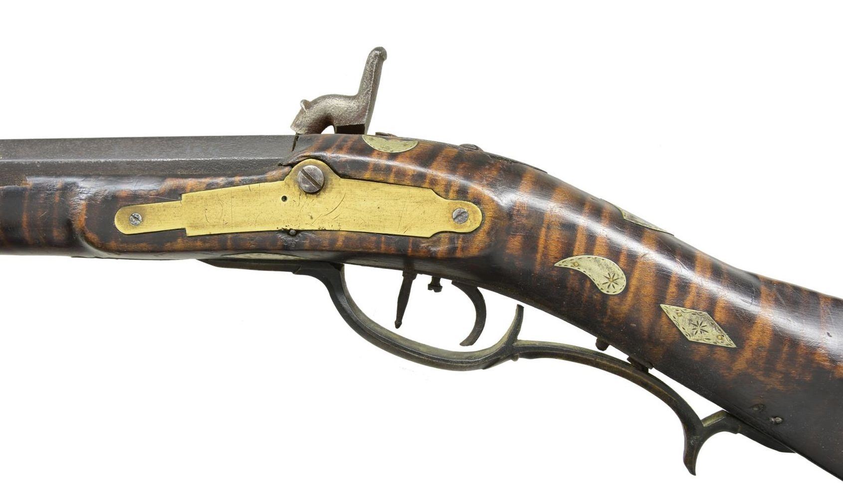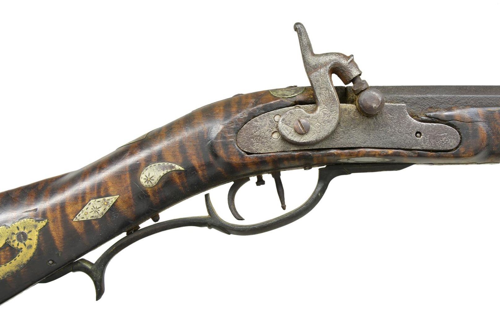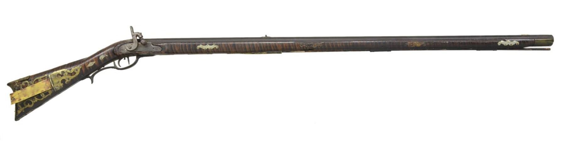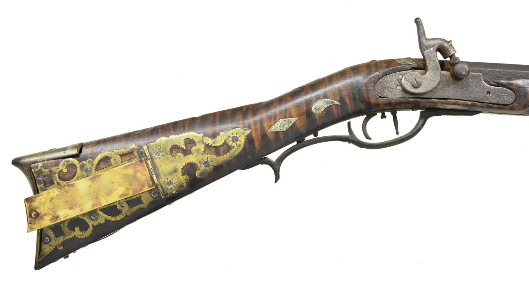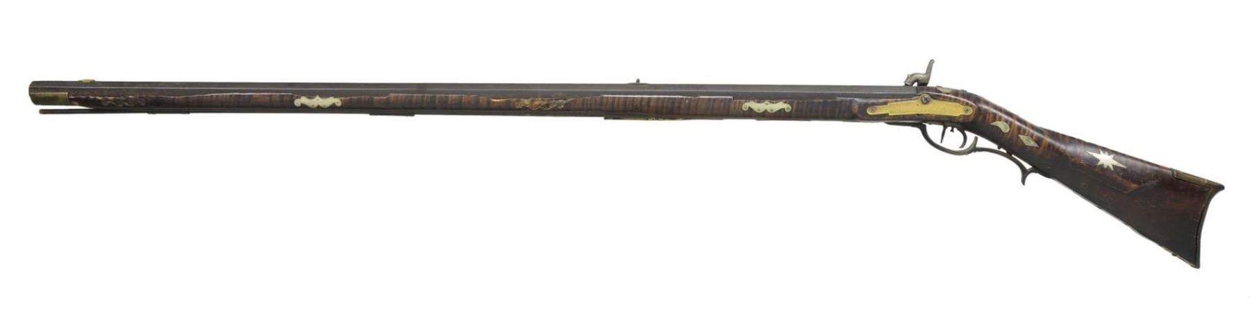 J. STAPLETON. Cal. 42. NSN. 41" swamped octagon bbl. is fitted w/ sm. U-notch rear & brass blade front sights. Top flat stamped "J. Stapleton" (most likely James of Todd, Pennsylvania working 1838-1890). Rifle fitted w/ trade percussion lock. Dbl. triggers are fitted. Stock of highly figured tiger maple extends to muzzle w/ 2" brass cap & is pinned to bbl. Rifle is brass mounted w/ grip spur on faceted trigger guard, crescent buttplate w/ 8" return, rectangular patchbox w/ multipierced sideplates & pierced scrolling finial also has some border engraving. Stock is also inlaid w/ a lg. number of geometric & scrolling German silver pieces. Lozenges & commas are at grip. An 8 pointed star is on sm. shadowline cheekpiece & other fancy inlays are along bbl. channel. Ramrod channel is nicely beaded & hickory ramrod mounts through 2 octagonal & beaded pipes w/ matching thumb piece. UNATTACHED ACCESSORIES: 4 inlays. CONDITION: fair. Iron parts w/ dark brown patina except lock which is almost cleaned to bright w/ some pitting. Brass of trigger guard nicely toned, other brass shows cleaning. A screw is missing at bottom of buttplate & it is loose. Patchbox latch also missing. Stock shows breaks & losses along bbl. channel w/ 4 inlays removed & in plastic bag accompanying rifle. Forend is broken through & shows glue repair 24" from muzzle. It appears there are some losses to wood channel on both sides. Bore is shiny, about fine. Lock is operable. PROVENANCE: Collection of Dr. John Persing. (01-19588/MGM). ANTIQUE. $1,000-2,000.