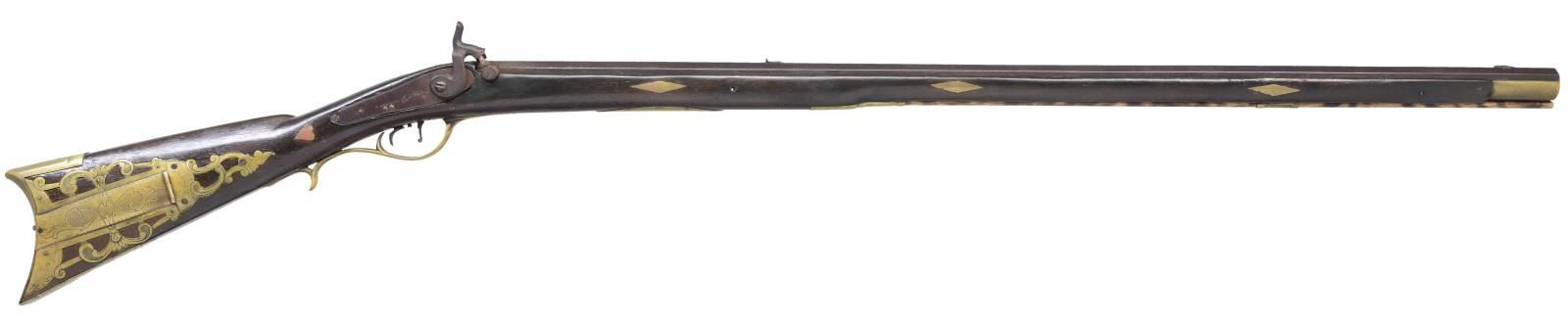 WITH N. ASHMORE LOCK. Cal. 42. NSN. Bbl. 38". Full stock percussion rifle with "N. ASHMORE" marked and lightly scroll engraved lockplate. Top flat of the octagonal bbl. exhibits a brass panel that is engraved "D Morton". Full length wood buttstock has been lightly sanded and revarnished at one time, featuring a brass buttplate, elegantly embellished patchbox, trigger guard, ramrod ferrules, and nosecap, with diamond and heart inlays present on either side, and a single pinned brass plate on the underside of the forearm. V-notch rear sight with brass blade front sight. CONDITION: metal components retain a dark gray patina, with mild to moderate pitting present overall, as well as an area of corrosion that is present on the bbl. around the bolster area. Brass components exhibit a pleasing mellow patina overall. Hammer does not lock into the rearward position. Stock exhibit some scattered marks and impressions from handling and storage, but otherwise remains sturdy and serviceable. (01-25098/MLW). ANTIQUE. $700-1,000.
