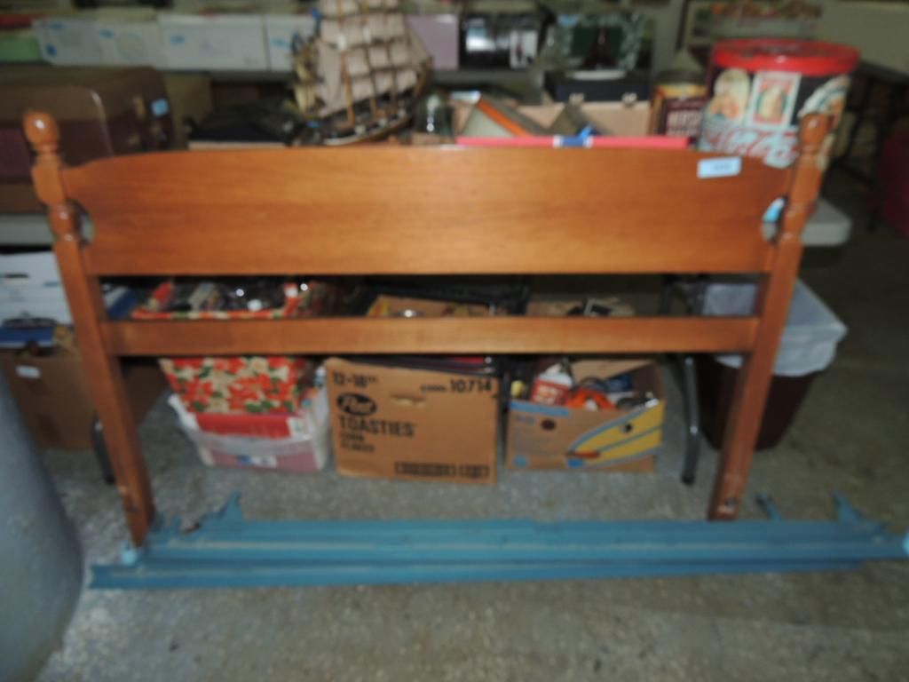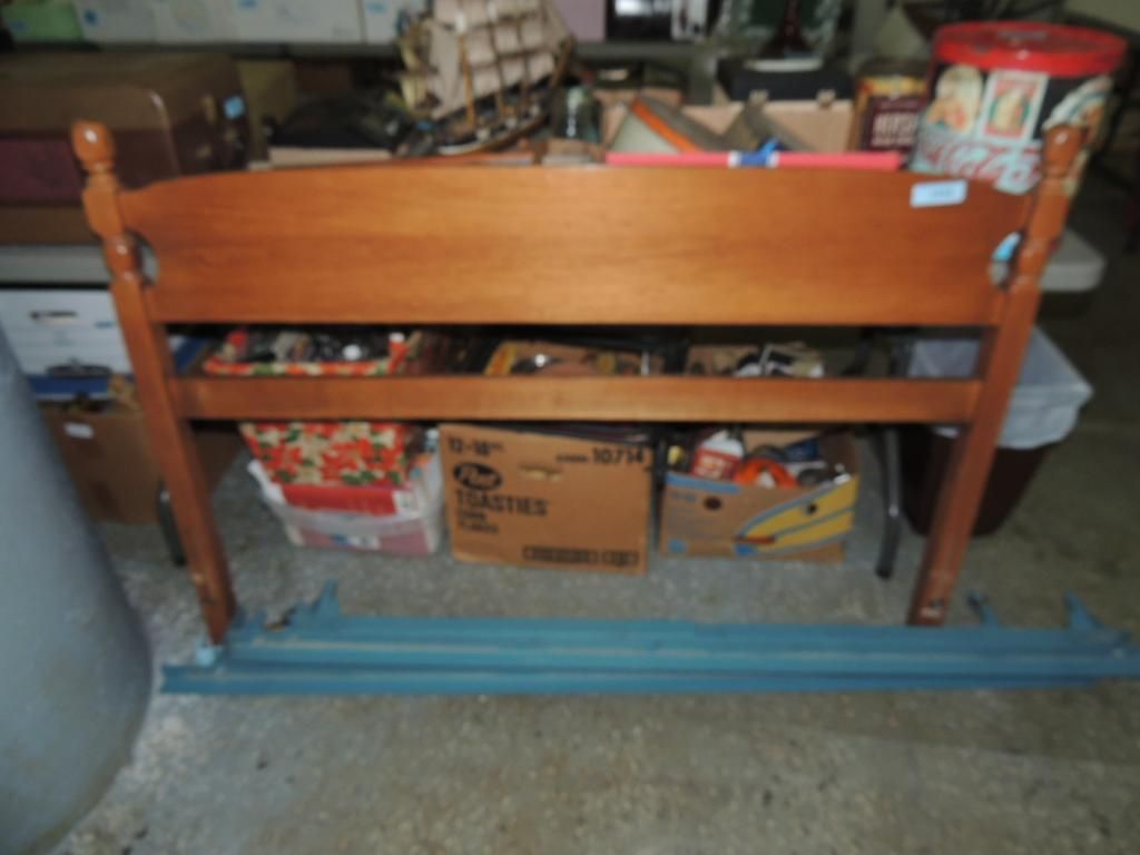 AMERICAN WOODEN HEADBOARD. VINTAGE HEADBOARD AND FRAME. AS SHOWN. SEE PHTO FOR MORE DETAILS.