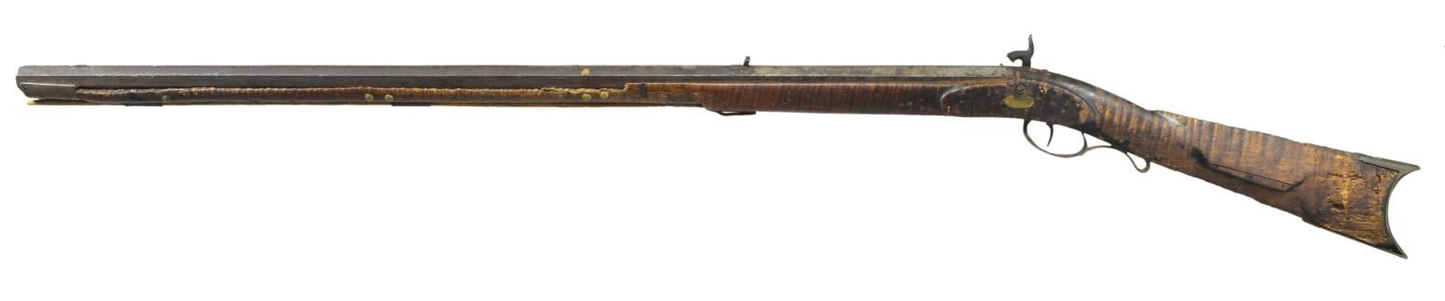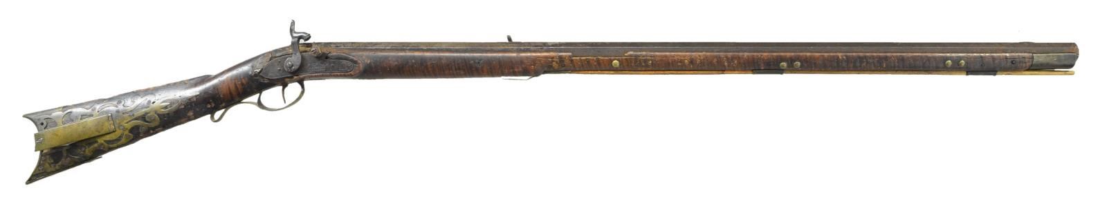 Cal. 36. NSN. 54” overall, 36” oct bbl. Percussion conversion “as found”, no bbl markings, lock “M MASLIN”. Large patchbox with 11 piercing, brass mounted