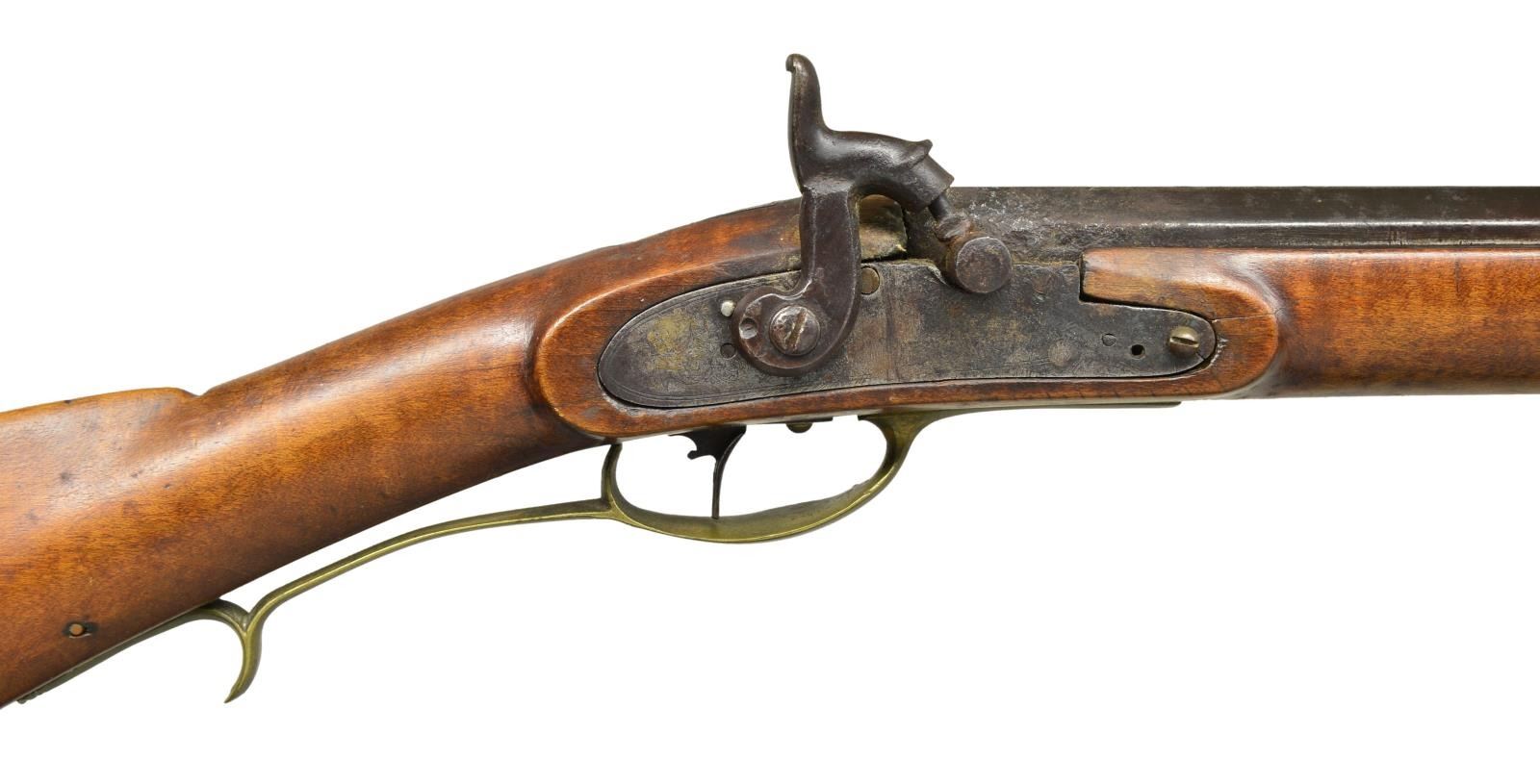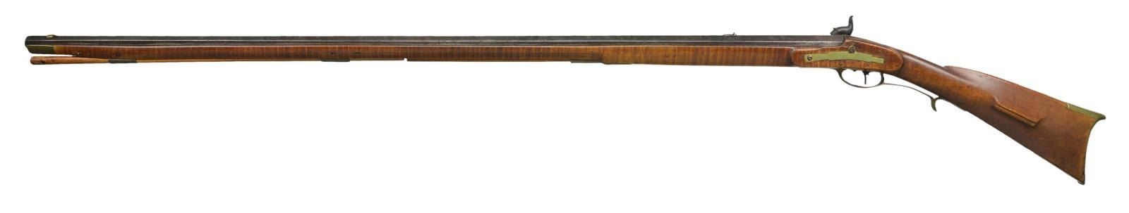 Cal. 69. NSN. Bbl. 43 7/8" octagon w/ smoothbore. Dovetail mounted brass blade front sight w/ fixed V notch rear sight. French style side lug conversion bolster. Engraved conversion trade lock having illegible marking. Plain trigger. Full length pin fastened maple stock. Brass fittings consist of crescent buttplate, toe plate, finger curl trigger guard, sideplate, thimble & nose cap. Ramrod channel has single line incise carving. Hardwood ramrod is broken at midsection & held by 2 faceted octagon brass pipes. WEIGHT: 6 lbs, 9.6 ozs. CONDITION: metal has dark brown appearance w/ scattered surface corrosion & heavy pitting at breech. Stock shows numerous scratches & marks w/ crack on right side of butt & filler making repair at toe. Functioning lock. Dark pitted bore. (01-22790/DS). ANTIQUE. $500-700.