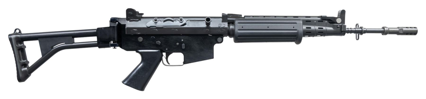 MACHINE GUN, BUILT WITH S&H SEAR. Cal. 223 Rem. S# FN033933 (Rifle) 2454 (Sear). Bbl. 16.5". A very clean original Belgium manufactured Fabrique Nationale rifle in the Paratrooper configuration, converted to select fire utilizing an S&H registered sear. The FNC, a scaled down & refined variant of the famous FN FAL was imported into the United States until 1987 and remains a rare & desirable rifle to this day. It utilizes a 2 position gas system w/ an integral grenade launcher front sight which functions as a gas shutoff valve when deployed. The gas system is adjusted to send more pressure rearward if the gun should become fouled by rotating the gas tube 90 degrees clockwise. This particular piece was converted to select fire by S&H Arms. It is complete w/ 4 position marked safety / selector. The left side receiver is marked "S" (safe) / "1" (semi) / "3" (3-shot burst) / "A"(Full auto). Dark black finish on all exterior surfaces. Protected post front sight w/ dual aperture rear sight. Right side folding shoulder stock. Ingenious spring loaded dust cover on right side remains under constant pressure, momentarily lifting during the firing cycle, to immediately be closed again upon firing. Utilizes standard AR-15 magazines. Left side of receiver marked w/ serial number & "FNC. 5.56 / FABRIQUE NATIONALE HERSTAL / MADE IN BELGIUM / GUN SOUTH, INC. TRUSSVILLE, AL. / CAL.223 REM. SPORTER". The lower receiver is marked "S&H ARMS / OWASSO, OK" w/ the corresponding sear serial number, on bottom, rear of pistol grip. CONDITION: exterior finish remains complete & consistent. Very few marks indicating use, even in areas of mechanical intervention. Finish color is darker on aluminum lower receiver than steel upper receiver, as typical. Stock locks tightly in the open & closed positions. Bore is bright w/ decent rifling. Fire control mechanism appears to be void of burst parts, like the vast majority of sear converted FNC's encountered, allowing only traditional select fire function & appears to function correctly when cycled by hand. NATIONAL FIREARMS ACT MG REQUIRING BATF TRANSFER BEFORE TAKING POSSESSION. FULLY TRANSFERABLE. (03-1884 & 25-4334/JZ). MODERN CLASS III. $9,000-14,000.