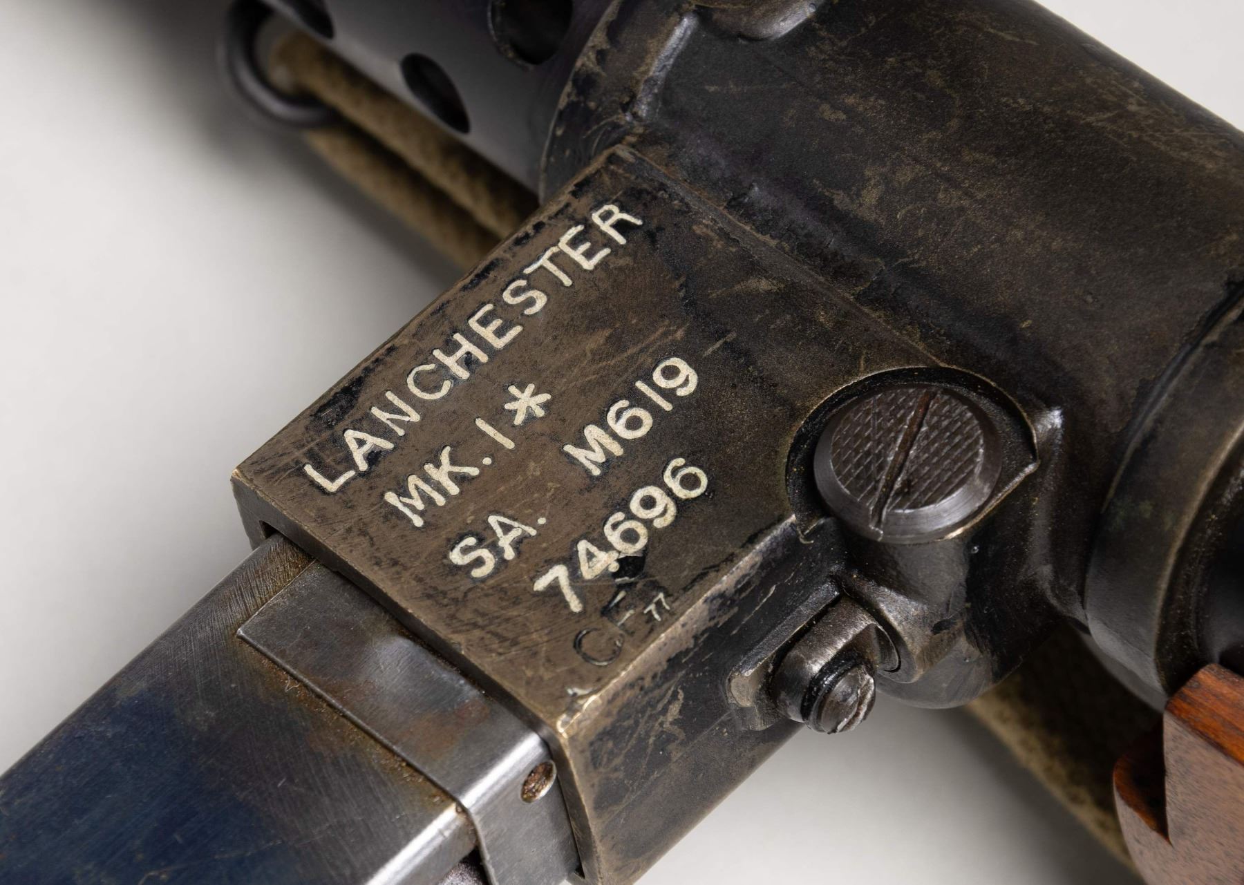 SUBMACHINE GUN. Cal. 9MM. S#74696. Bbl. 7.75". The British Lanchester Submachine Gun was designed by G.H. Lanchester & manufactured by the Sterling Engineering Company. It was heavily influenced by the design of the German MP21 II. The muzzle end of the barrel jacket includes a bayonet boss & stud for use w/ the Mark 1, Pattern 1907 bayonet. Typical of pre-WWII SMG's, it is heavily built w/ a difficult degree of manufacturing, compared to many of those designed later, when necessity was more important than design perfection. The early examples were select fire, while the later guns, such as this example, the MK. 1*, built as a full auto only. It was once fielded by the British Navy. The muzzle end of the unique circular perforated barrel shroud has the appearance of an old "Pepperbox", w/ many barrels, while the outside holes are only actually functional as cooling ports. Like the popular Sten, the magazine presents from the left side. Tubular receiver. Protected post front sight. Dual aperture rear notch sight. Wooden shoulder stock & forend. Brass butt plate & magazine well. Sling swivels, front & rear, currently sporting tan, canvas sling. MAGS: 2 steel 50 rd. CONDITION: Black flat Suncorite style finish coverage is quite complete, still partially covering Brass mag well. Bore is bright w/ strong rifling. Fire control mechanism appears to function correctly when cycled by hand. NATIONAL FIREARMS ACT MG REQUIRING BATF TRANSFER BEFORE TAKING POSSESSION. FULLY TRANSFERABLE. PROVANANCE: From the Lifelong Collection of Brian Linde. (03-1901/JZ). CURIO CLASS III. $8,000-12,000.