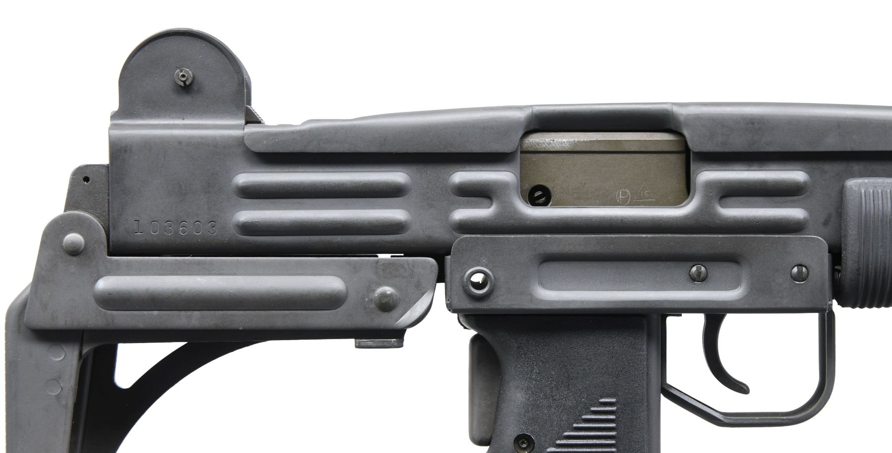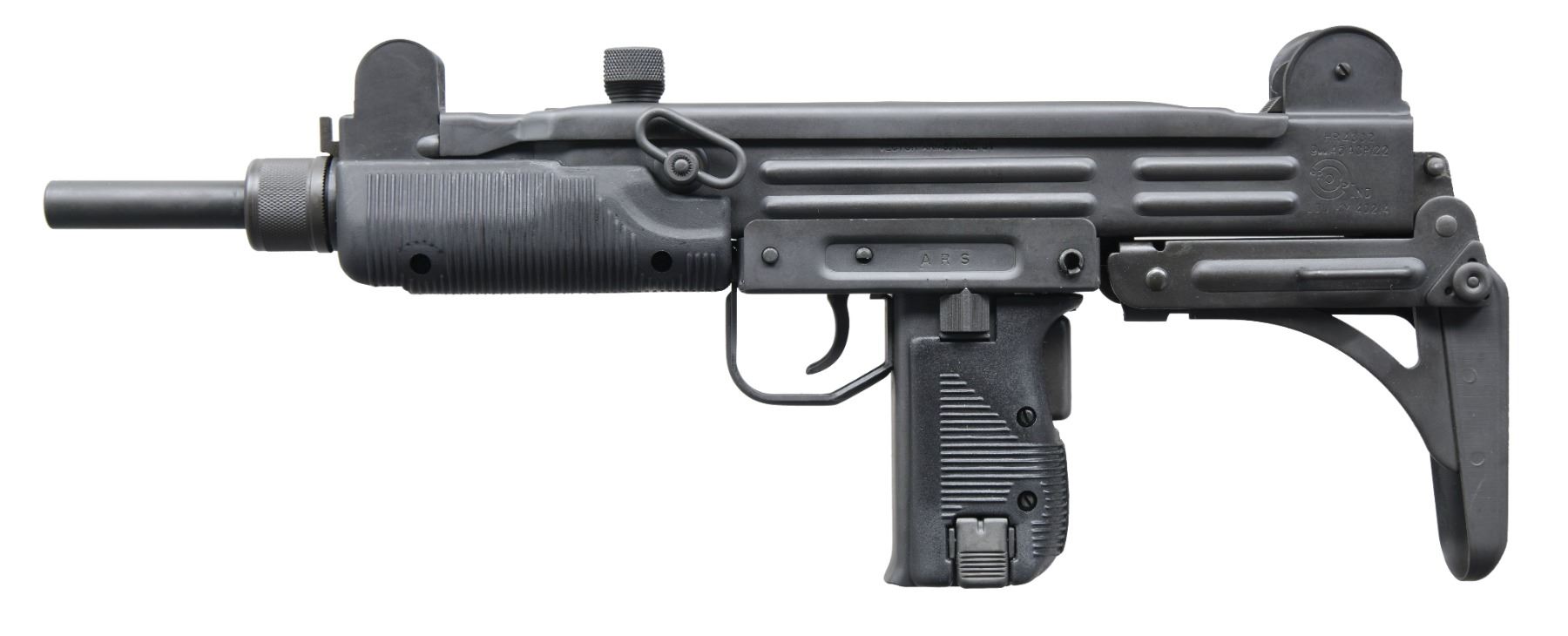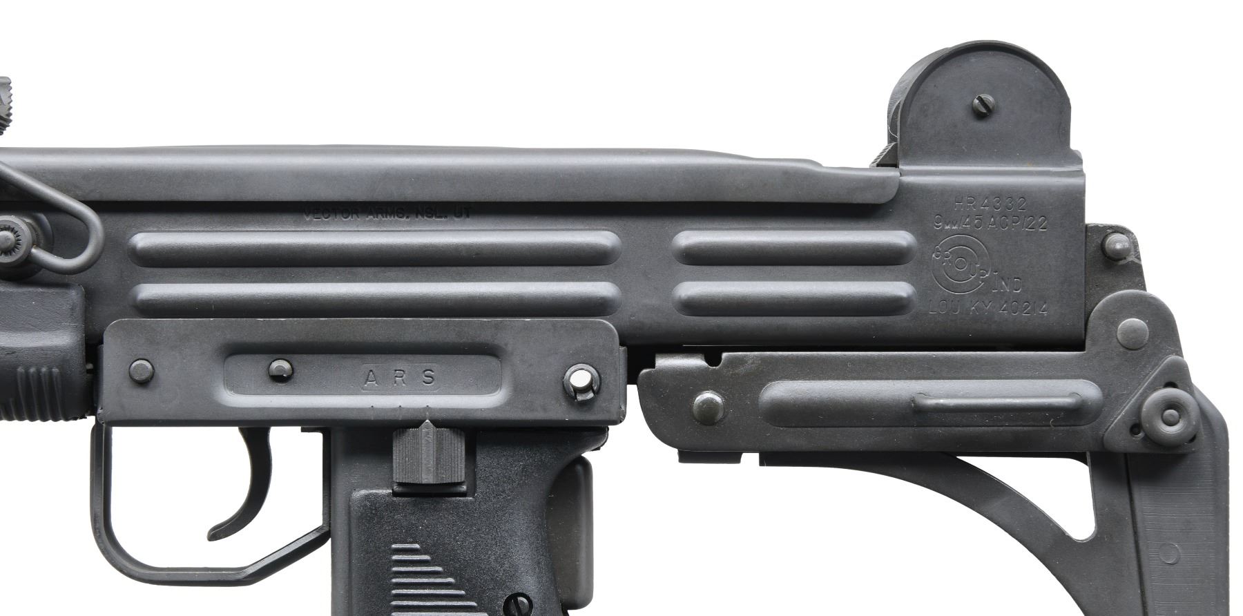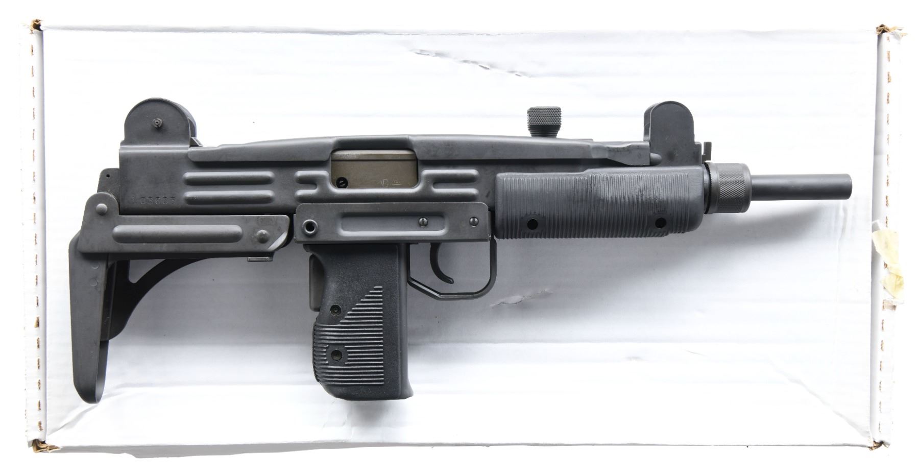 DESIRABLE GROUP INDUSTRIES / VECTOR ARMS HR4332 UZI SUBMACHINE GUN. Cal. 9mm. S# 103603. Bbl. 10 1/4". 1 of only approx. 3,300 Group Industries HR4332 receivers purchased and assembled by Vector Arms with quality South African parts and components. The HR4332 receivers are amongst the most desirable for an NFA Uzi, being specifically heat treated for use as machine guns. This example is stamped "VECTOR ARMS, NSL, UT" on the left side of the receiver, followed by the model and cal. designations, above Group Industries logo and mfg. information. Right side of the receiver is marked with the S#. Selector is marked "A", "R", and "S". Metal components exhibit a parkerized finish overall. Grips and forend are comprised of grooved black polymer. Model A pattern post front sight, with "L" flip-up rear sight, graduated "100" and "200". Distinctive collapsible Uzi pattern buttstock, with Model B pattern sling swivel, featuring 360 degree rotation. Mag. is absent. UNATTACHED ACCESSORIES: generic white cardboard box. CONDITION: extremely fine, with metal components retaining bountiful amounts of their original factory parkerized finish overall, exhibiting few minute superficial handling marks, with some very light wear present on the receiver cover from cycling of the action. Brilliant mirror chrome lined bore, retaining well defined rifling throughout. Polymer furniture shows a few very light superficial marks from handling and storage, but otherwise remains sturdy and serviceable. An extremely fine and attractive example of a Group Industries / Vector Arms HR4332 submachine gun, that one would find to be difficult to upgrade from. PROVENANCE: From the Estate of Ivan Lee Shapiro. NATIONAL FIREARMS ACT MG REQUIRING BATF TRANSFER BEFORE TAKING POSSESSION. FULLY TRANSFERABLE. (03-1767/MLW). MODERN CLASS III. $9,000-12,000.